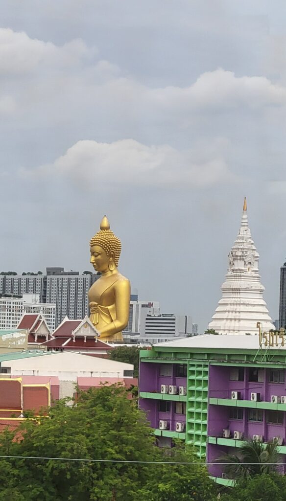 After we left we did the reverse route home, (bus, metro, sky train). We did see the BIG sitting Buddha that dominates some of the skyline in Bangkok (coming and going on the metro). I snapped a couple of pics. We arrived back at our area around 1630, just as we had a light spitting of rain. We stopped at the close by 7-eleven for water.