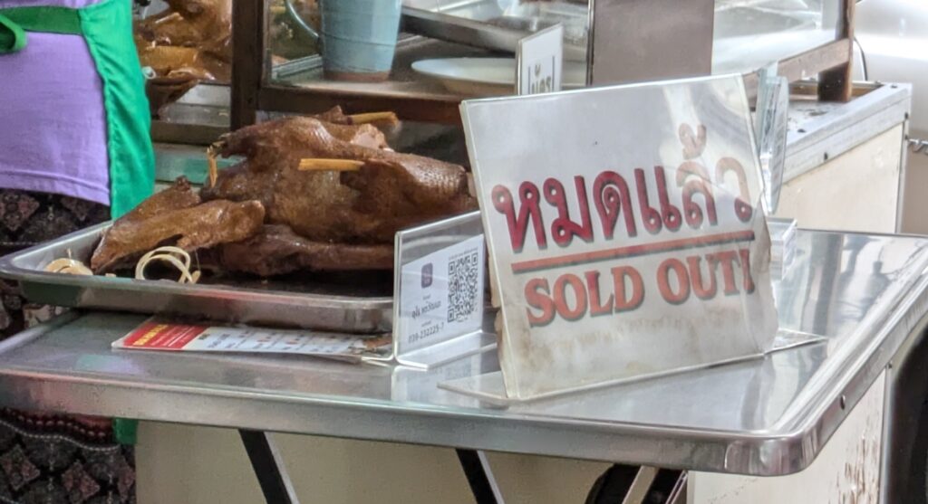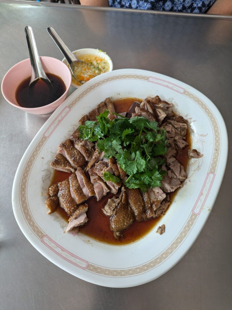 Urai Braised Goose, it is called. The place opens at 1000, according to Google – and its only open for 3hrs only! When we arrived the place was hopping. There was an empty table so we snagged it, after I asked a table of four if it was open. One of them, a lady said to get a number. So Jeff got that. We were #23. No idea where that is in relationship to the number being served. So we just waited. At 1045, I saw a sold out sign go up where the bowl of laminated numbers were! Yikes!! Jeff said don’t worry. One of the waitresses was looking around, I held up our number. She saw it and moved on. Jeff then said relax. But I couldn’t. I could see the cooked geese and the head guy cutting them. I was salivating, well almost anyway! Finally, the waitress came to us with a menu! Yeah!! Their are three items on there: goose- in various portion sizes, rice, and soup. We just wanted the goose- medium sized portion, that will feed two to three people, supposedly. She took back the menu and left. Then I saw more cooked whole geese come out and the sold out sign go down. HUH! Questions!?1 But then I forgot about all that as our order started arriving!