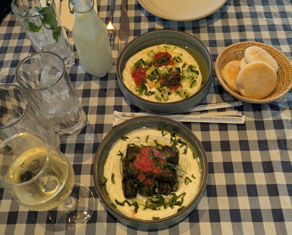 After services we got on the Sky train, or the BTS. We arrived at a stop close to Phil coffee, and got off walking the small distance. I had bought coffee here before. When we arrived inside Phil’s, I could not remember which coffee I had bought. I narrowed it to between two of them, so I just chose one, and had them grind the coffee beans. Coffee in hand, we walked across the street, literally, to a Greek place, called Helena Greek Kitchen. We did not eat here last time, because the times I had got coffee before, the restaurant was not open. We decided on appetizer type foods. We split an order of Tzatziki (which is a yogurt sauce with cucumber, garlic, dill, and olive oil) with pita, and an order of Dolmades (which is grape leaves stuffed with meat, rice and herbs). Jeff had a Greek lemonade and I had a house Greek white wine… it was all enjoyable and so good. Finished we paid 1100 Baht ($31.77) and hired a ride back to our place.