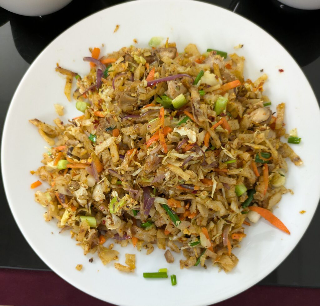Now we just relaxed. I blogged and Jeff read. Around 1600 we were hungry, having only had two light meals we were ready for supper! Jeff had spied a Sri Lankan place, called Manel Lanka Restaurant- Original Sri Lankan Food. It’s only two blocks from us, so we walked there. The area we are in is very Indian influenced – like a Little India in Bangkok, Thailand.🤣 When we walked in, we were the only foreigners, and everyone looked at us. We were directed to a table and given a menu. We ordered Chicken Koththu, and Set Menu Mutton, which included rice, Mutton Curry, Dhal Curry, X2 Veggie Curries (maybe a mushroom(?), and carrot), and Sambal. There was also a small bowl of salad, and fried crispy pita with the set menu. The very first taste of the food sent us back to Sri Lanka – as we had been sent back to Greece at lunch – this was only fitting, and much appreciated! We don’t find Sri Lankan food just anywhere!! We enjoyed it! Now we were satiated and full. But we could not finish the Koththu and opted to have the last of it boxed as take away. We paid 650 Baht ($18.77) for the whole dinner. Crazy! We had so much more food than at lunch and almost paid half of the price. It shows the difference in local verses touristy places. Anyway, we walked back to our place and unloaded the Koththu.