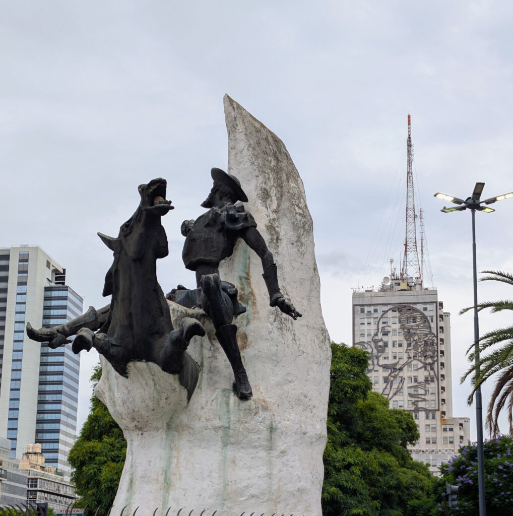Around 1630 we set out to get some steps. We went about 2 km north and over to the main street near us… Avenue 9th of July, which is Argentina’s Independence Day. We arrived at the Obelisk. It is a landmark monument, made in 1936 from Cordoba white stone, and it is 235 feet in height. It reminded us of Washington’s Monument. We walked in the promenade in the center of the divided road for a bit. It is a very busy road – nine lanes of traffic, divided into four and five lanes going one way; then two lanes of bus traffic going with two coming; and lastly nine lanes of traffic coming, again divided into five and four lanes. So essentially 22 traffic lanes but divided into four ribbons- if you will. We walked in a little oasis between two of these ribbons. It is not as chaotic as it sounds because there were many buildings and trees. The buildings here are taller and this dwarves the road some. The many trees lining the walkway we were on are flowering – pretty pink, yellow, white and purple. As we head south one particular, tall building in our view – that we can also see from our rooftop – was the Ministry of Public Works. It’s significant because it boasts two large outline murals of Eva Peron – one on the north and one on the south side. Eva Peron was a beloved first lady in Argentina.