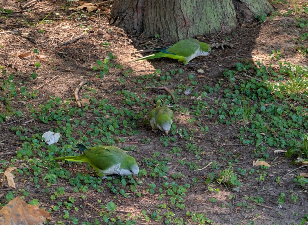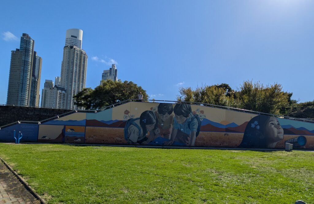 We went down near the area we had stayed February 12 the night before we went off on our Antarctica Cruise. It was near the ocean along a river, Rio Darsena Sur, which we did not recognize as a river before. Anyway, there were some permanent loading cranes here. Did this used to be the ocean and some land has been reclaimed? Or, were ships brought in here and unloaded? Questions. But the cranes are not in use now and seem to be more or less decoration. We moved on, heading to a large park area. We walked around it – enjoyed a large painted mural on a wall and a rose garden. It was a lovely green space. There were more Monk Parakeets. Some people were there, mostly dog walkers. In general, this area is more upper end and touristy, but the park had more locals in it.