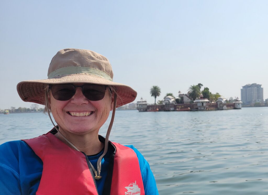We stopped at the boat dock area, Jeff found the ticket stall and he procured boat tickets. We loaded on the boat and went on a partial circle of the lake, passing by “boat fountains” with lights (would be pretty – all lit up at night) and platform statue of a herd of horses with a stop in the middle at Jag Mandir, our destination. This is a palace commissioned by a wife ‘as a place for recreation and amusement’. It is very picturesque from the shore to here, but the palace has seen better days. The palace was made in the 17th Century, and was ‘a marvel of architecture’. It is now a haven for birds of all kinds. There were multiple large raptor birds, many black and white birds (these had a pleasant chirp chittering), and of course, pigeons. Looking back to shore was picturesque as well. You could see the Park replicas – Pyramid, Taj, ect.;  a round defensive tower; as well as a temple-looking building, called Kishore Sagar talab kota.