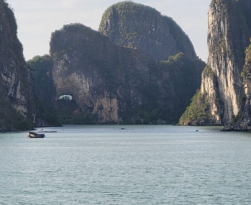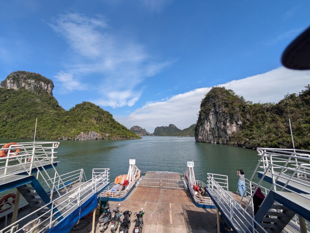 At 1230, we arrive at the ferry. Jeff had noticed the ferry on Google maps and checked where it went. A You tuber said it is a cheap cruise through Ha Long Bay. It cost us and Clink 140K Dong ($5.52) to go to Ha Long town. Wow! It is as great as I remembered. I know now I enjoy these Karst mountains better in the water than on land. Spectacular! Jeff bought a beer and some popcorn for 50,000 Dong ($1.97) on board, we enjoyed them as we took in the scenes! Arrived at 1420 into Ha Long town. It is on mainland Vietnam and is bigger than Cat Ba. We did not have anytime to explore, though. We awaited at the harbor to do the return ferry at 1500. Both of us and the scooter was 140K Dong again. Jeff did get gas here – 50,000 Dong worth ($1.97). We also bought another water for 25,000 (99 cents). We saw a seaplane go out and return (we could not see it take off or land though). But that was cool!