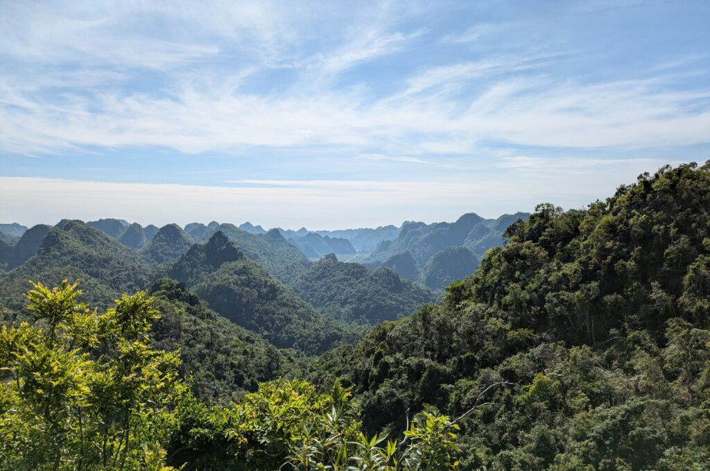 Now we hiked up – mostly – steps of concrete. I definitely am not getting enough cardio! Jeff said the same. There are so many dancing, butterflies as we climb – it helps to distract us. But the views over the Karst land topography… so worth it. We arrived at a two story view and stop briefly, but a group of three Asians were playing loud country music here, so we didn’t stay long. We continued on… to the top. Wow! Here we relaxed, had our banana and enjoyed nature – by ourselves for a bit. It was special. Refreshed we start the descent. We were glad the weather was coolish and mostly shaded from trees along the way. These trees, Kim Giao, are actually protected, as they are rare. By a placard, “according to legend… the tree had the miraculous power of detecting poison. Since then it has been traditional to make chopsticks from this wood.” Then we climbed the loop back down and stopped for a big bottle of water and a tea – 30K Dong ($1.18). Then on to Clink.
