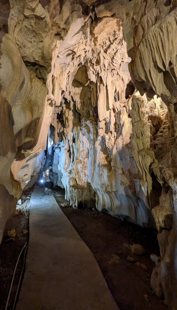 Our ticket included the Trung Trang Cave, so we went there next. Because this part of Vietnam has so much limestone, the caves are great here – Vietnam has some of the largest caves in the world. We presented our ticket and did the ascent of formed cement steps up to the cave. It is actually a number of stories up. We make into the cave and once again are awed. Considering how much manmade paths have been added inside; how vast the amount of lighting run in; and as many people have been in here – there is still wonderment. A drapery-type formation here, a candelabra there and many stalactites and stalagmites… incredible! We had to really bend through some places… three foot openings. The cave is warm and humid, surprising to us! Now we leave the cave – it was a walk through and we have to walk back on the road to Clink.