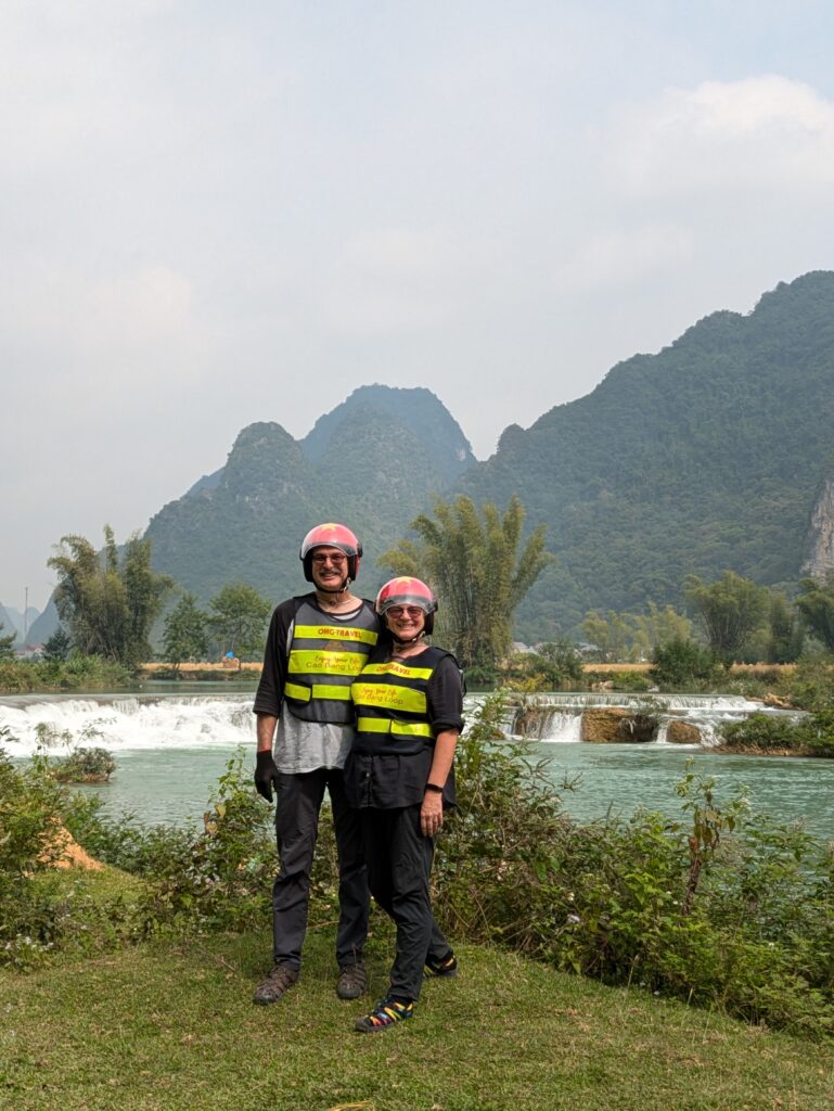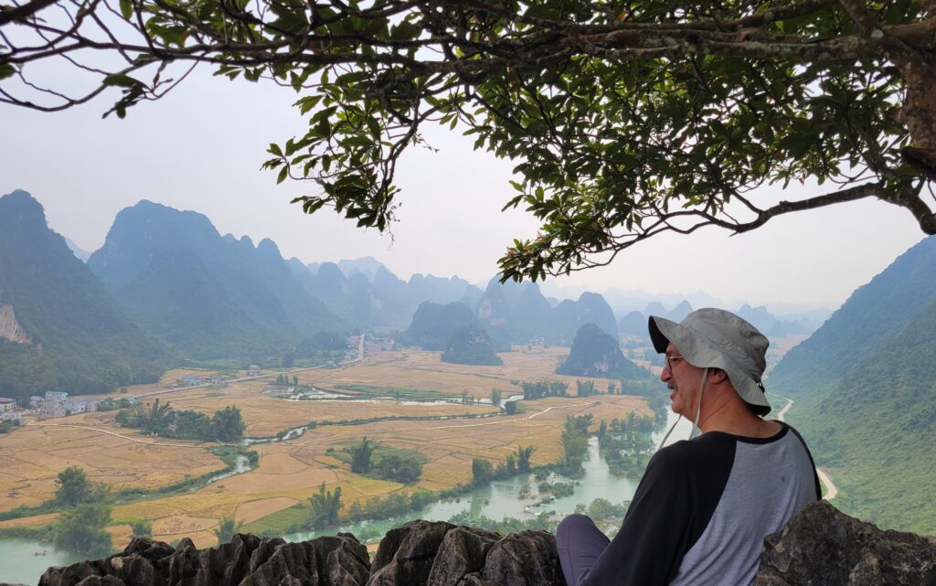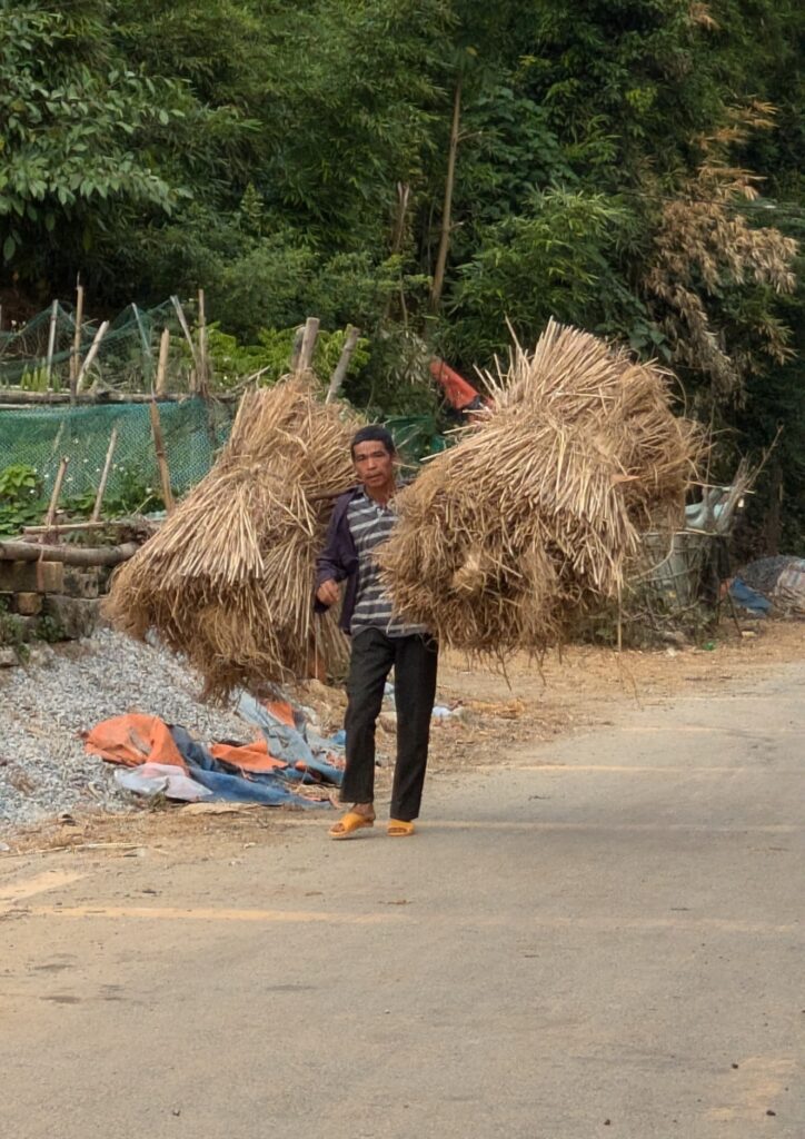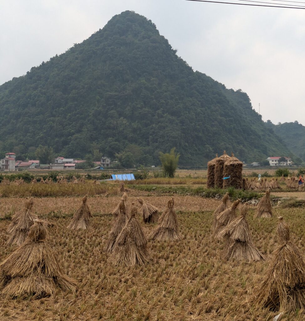 At 0900, we stopped and Em took us on a hike up a scenic overlook. Goggle calls it a Panoramic View Trail. I stopped at the first overlook area, it was a bit too much for my knees. Jeff and Em went on up. It’s a great spot – looking out to the valley below, and at the fields just harvested with horses grazing. This whole area is so scenic – seeing and hearing the nearby river is so peaceful. I could hear kids playing, and roosters crowing. There are a bunch of butterflies flittering all about, anywhere we go around here. Also I did not mention yesterday, the waterfalls and some of this area is a part of UNESCO Global Geopark. Which means it “is an exceptional territory in which it’s possible to explore the history of our Planet Earth for over 500 million years through protected sites,” as per Cao Bang Geopark website. Jeff and Em came back down and we all got back on the bikes by 0930.
