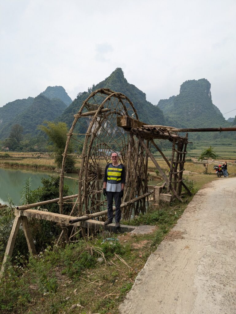 We didn’t get very far until we stopped again at a little rapid area where a man was fishing. It was a photo op place for Em to take our picture(s! She has to be an instagrammer. Hee-Hee) Then we got going again to stop again this time at a water wheel 🛞 on the river. We saw some yesterday, but they weren’t operational – this one is. The wheels carry water from the river up into sluices/troughs. Then the water goes into irrigation canals, and finally to the terraced plots, albeit rice paddies or corn fields. That was neat to see. We now load up and move on.