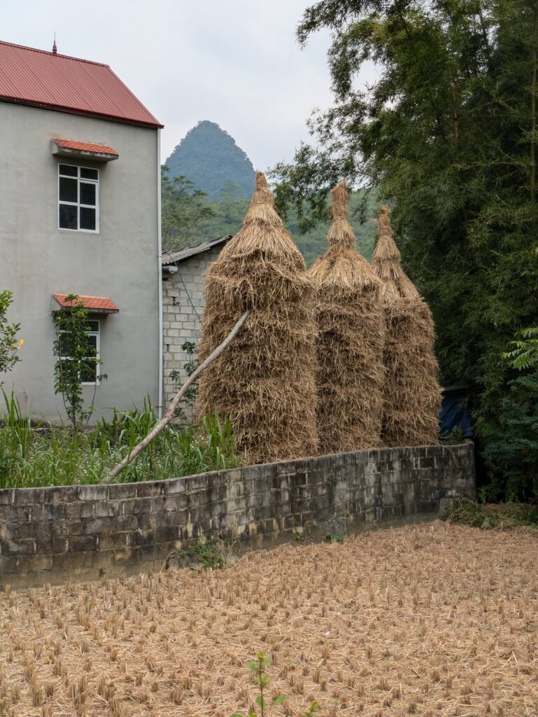 So many locals are still dealing with harvesting. I could not get enough of seeing the bundled rice straw. It was here I also noticed how they stack the bundles around a post and it gets 20 feet tall. It was just so beautiful especially with the backdrop of the karst topography and an everpresent river. Our next stopping was at a bridge over the river another idealist photo setting, but worthy of taking a small rest to stretch and get off the bikes. As we get onto the bridge, there’s a “pen” in the water for ducks. We load back up and push on to our lunch spot.