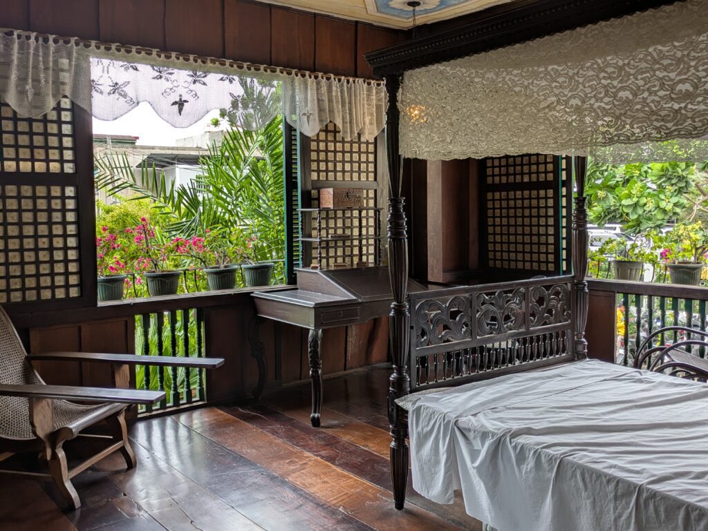 Next we went up the main staircase into the actual house. It is still furnished with furniture pieces from the last generation of the Gerardo’s. The pieces were beautiful, masterfully carved wood. The dining table table was a large round, one piece top! Interesting tidbit, this past Holy week a family member of the third generation visited here. She is 91!!! Our guide said she comes every year! This fact was worth getting the guide for me. How cool is that – this lady was born here and still comes to see the house she grew up in! Amazing!