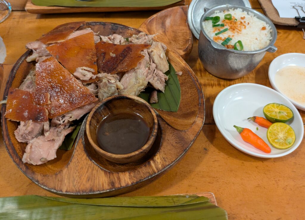 We finished the tour and E-hailed a Grab taxi to get food. We went to The House of Lechon. Cebu is renowned for Lechon- which is whole roasted pig. We had a ½ kilo of Lechon, which is just over a pound, and a garlic rice that we shared. I had a strawberry shake and Jeff had a Red Horse Beer. The pork was so tender and flavorful. It came with a broth-type Au jus and a coconut vinegar called Sinamak. It cost us 1248 PHP, which was $22.01.