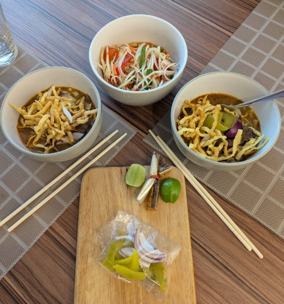 Around 1730, Jeff went out to a local food place and got us some takeaway Beef Khao Soi soup and Green Papaya salad. The soup was good, but the salad had too many dried shrimps making it taste a bit fishy plus it was very spicy. Jeff said he’d told the person a little – to which the person laughed. We finished and took in our laundry. The evening was just relaxing and watching some YouTube.