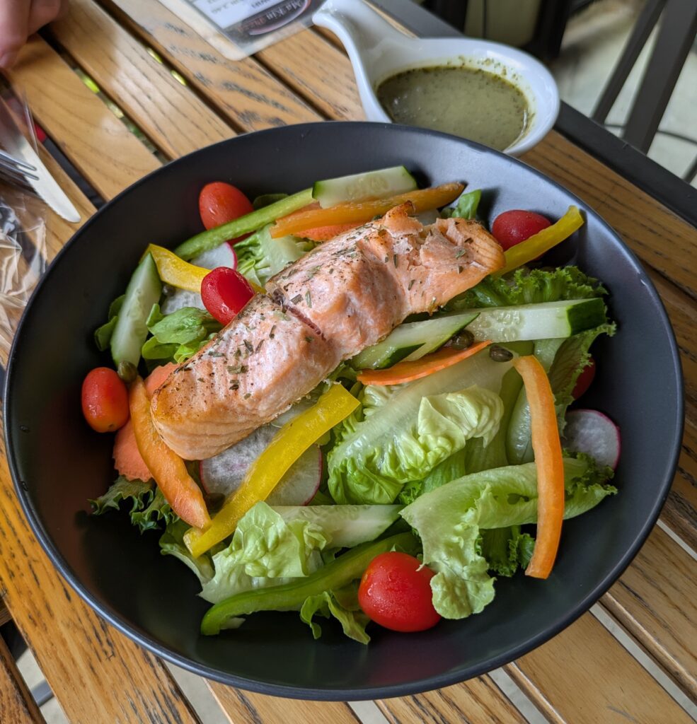 We decided to go out for — pizza-pizza, at Ma Kin Pizza. It was real close so we walked. We ordered a Salmon Salad of lettuce, cherry tomatoes, dried tomatoes, cucumber, bell pepper, capers, radish, and a big salmon steak on top; and a Greek pizza of olives, sun-dried tomato, onion, spinach, bell pepper, Feta, Mozzarella, and oregano. Both were great 😋and hit our spot. I had a Honey Ginger Lemon soda, and Jeff had a Singha beer. When we finished we ordered a Tiramisu take away for later. Total bill was 1000 THB ($30.68).