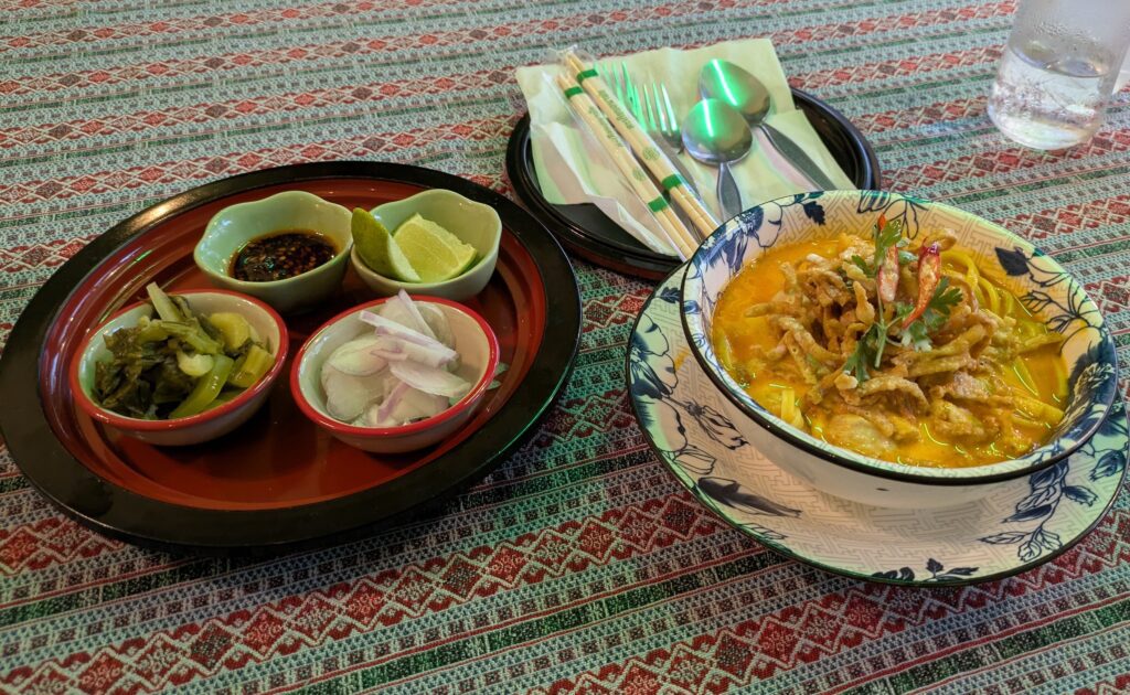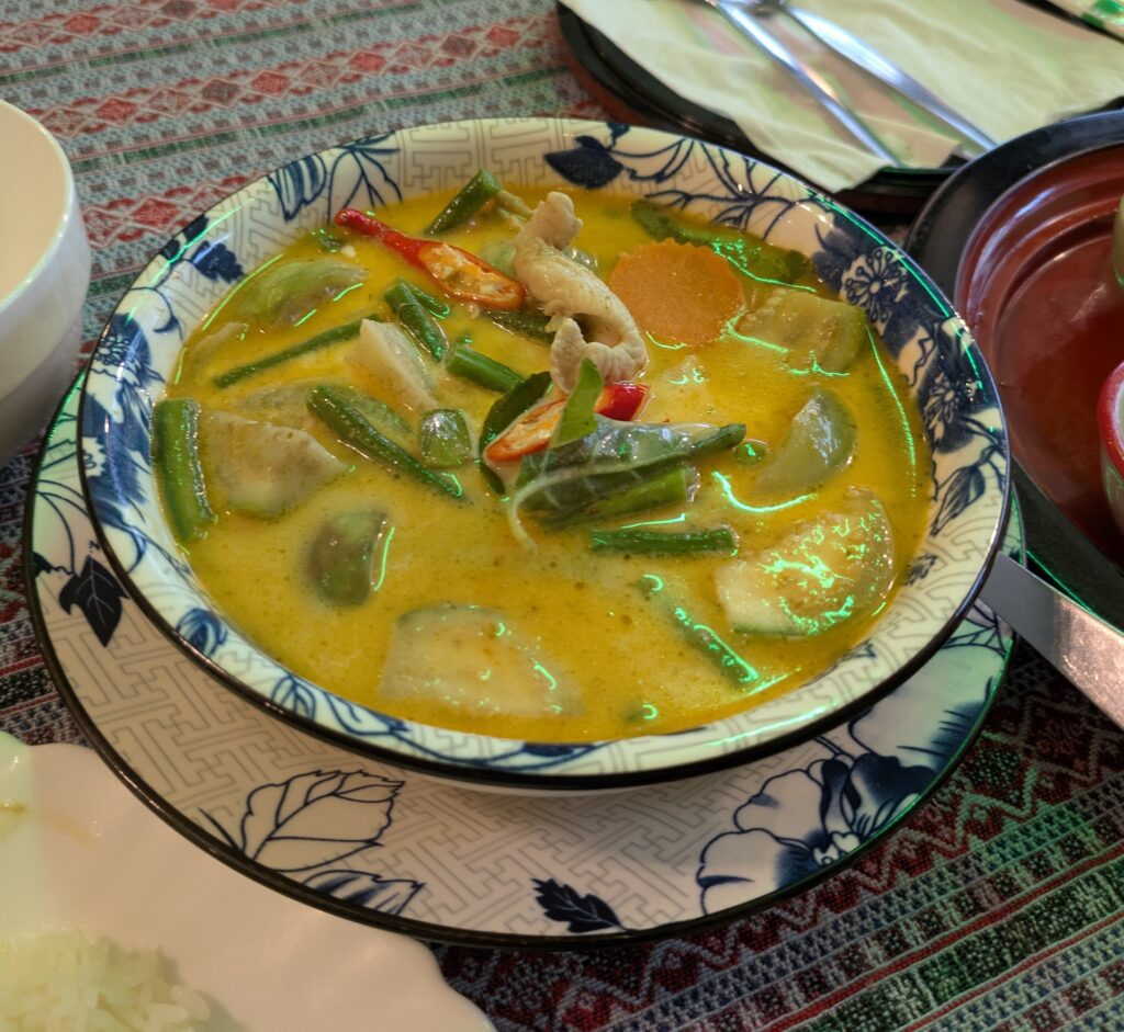 Around 1730, we chanced going back out for supper. We choose a local family run place called Rywin Cafe. We ordered one Green Curry with eggplant, green beans, carrots, onion, Kaffir lime leaves, and chicken breast served with steamed rice; and a small Khao Soi which is noodles in a great flavored, intense coconut curry with chicken and topped with crispy noodles. Khao Soi is a northern Thailand dish, specialty of this area, which the owner made sure we knew! What fun! Both dishes were super and we will be eating here again!😋😋 I had a water and Jeff had a Chang beer. As we were finishing the owner (both he and his wife were friendly, very nice, and helpful) brought us a bowl of Mangosteen! These are the craziest looking fruits… red with green soft spikes all over it. He took time to show us how to peel/open them and eat the white fruit inside. The fruit is the texture of a peeled grape, but very mild to little sweet flavor and has a big almond sized nut in the center. We each ate 2 or 3 of them. Supper was 300 THB, which is $9.20. The fruit was gratis!🤯 We left as there was a slight decrease in the rain, and again made it back before the heavens opened up.