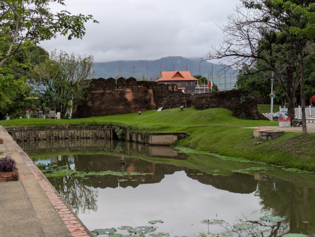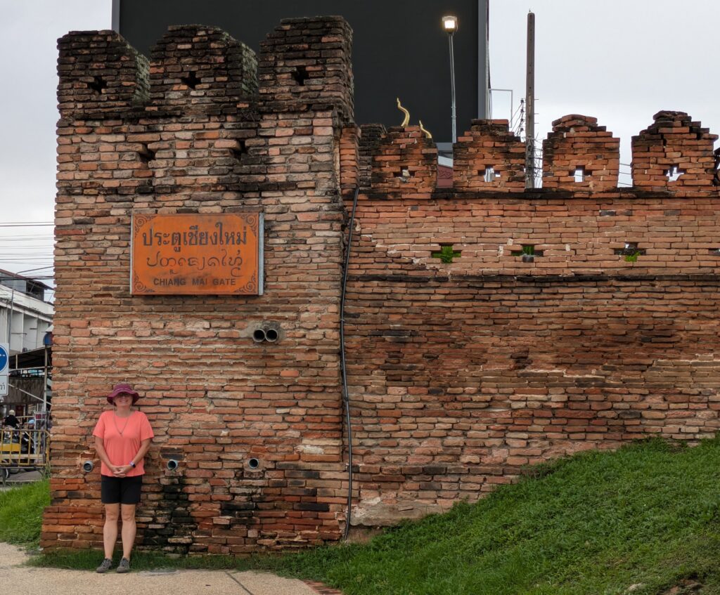 We both awoke early and set out by 0645. This morning’s weather was cloudy but it should not rain. So we went to Chiang Mai’s old city walls and moat. We parked Baloo just inside the old part of the city, on the counter-clockwise one-way road, but we went out to walk on the clockwise one-way road, as most of the descriptive signs are readable from out there and the moat was better seen from here. (Now, much of the following info was from placards, scanned QR codes, and a helpful article called Walls and Gates of Chiang Mai from Chang Puak Magazine.)