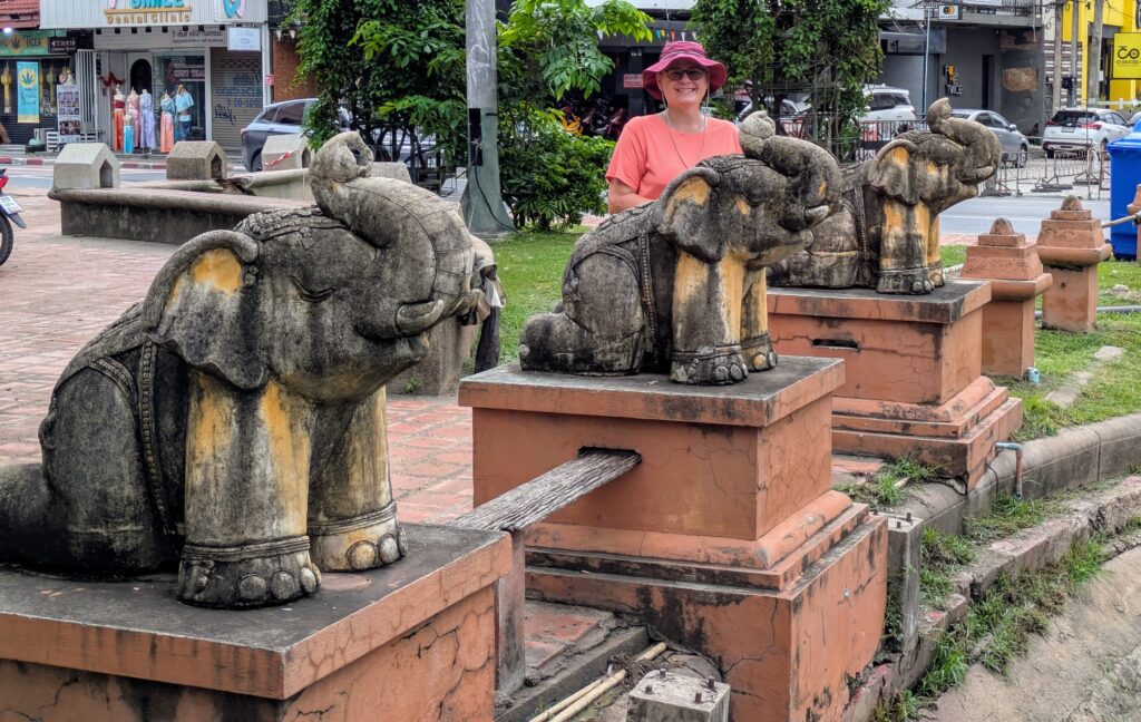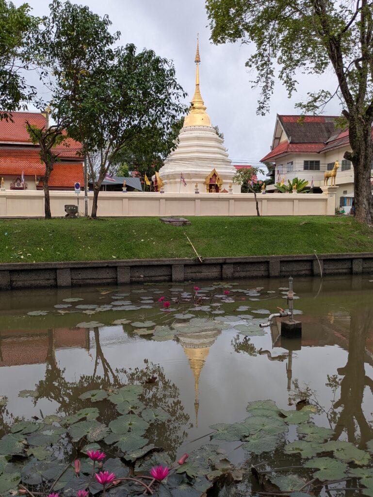 Anyway, we walk on we were on the north side now and see some of the brick walls still standing. This is the prettiest side for me with the walls and the moat & its water lilies and fountains flowing. We pass the two Wats we visited yesterday and another one, Wat Khuan Khama that was reflecting beautifully in the moat water – gorgeous! Then we came up to the “busy” gate and the one considered the most important, Chang Puak Gate. “It was used by royalty on state occasions… Chang Puak means the ‘white elephant’, in honor of two servants who saved King Saen Muang Ma’s life.” There are Instagram elephants outside of this gate, but they are pink, blue and yellow… not white!🤣😂