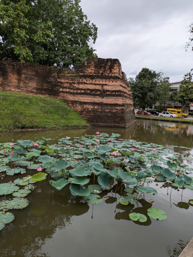 Now, we walk along the western side, and passed the Suan Dok Gate. There was not an information placard here. But the article listed above, referenced that Suan Dok means ‘door to the flower garden’. This gate lead to a “royal flower garden outside the city walls.” Next, we came to Hua Lin Jaeng, in the Northwest Corner. It’s meaning is ‘head’ (Hua) ‘of an aqueduct’ (Lin); and it is a “brook Huai Kaeo (that) was channeled along an aqueduct, over the moat into the town, and passing through the bastion.” The inflow of water from the creek can be seen streaming into and sustaining the moat still. Surprisingly, the water level is quite shallow here, it actually seems silted up, maybe?
