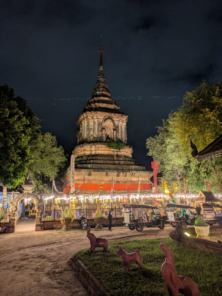 Now we went back to our place and chilled out, literally. I blogged and Jeff read. No lunch needed, but by 1730 we were hungry. We went back out to a weekly Saturday street scene, checking a lot of it out. We settled on the food court area with the opening sign reading, ‘Seat/Food Handmade Ideamarket.’😂 We walked all around and decided on four different stall’s food. They were Indian Food- one Veggie Samosa each, with two great sauces, equaling 90 THB ($2.74); Fish Cake- one small bowl of Fish Cakes (balls with deep fried Holy Basil) for 40 THB ($1.22); a sausage booth (no name on the stall)- one Sour Thai Sausage, 20 THB ($0.61); and Pad Thai- a Veggie Pad Thai for 50 THB ($1.52). Then we decided on a dessert, getting a Coconut Ice Cream from ‘Homemade’ stall, which costs another 50 THB ($1.52). Total for all the food was $7.61. We finished just in time to boogie back before the rain. Stayed at our place until 2000 then went back out to see around Chiang Mai’s walls and the Wats from yesterday at night. A quick zip around on Baloo – it was lit up so well, dazzling.