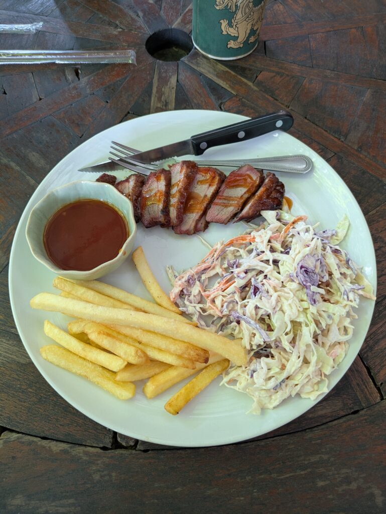 We left and decided to go to a BBQ smokehouse, called Old City Smokehouse, for lunch! Jeff had found it. When we arrived we were the only customers. I actually thought the place was closed. We were greeted and seated with a menu, of which the opening page says… ‘meats have been smoked at the corner (one of the four corners of the ancient wall of Chiang Mai dating back from 1296 AD) for more than 725 years.’ WOOHOO!! We ordered two main entrees: