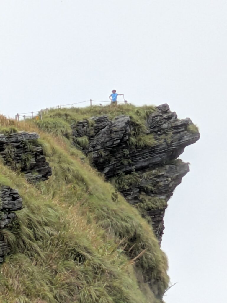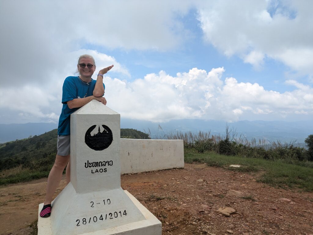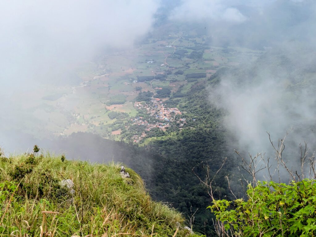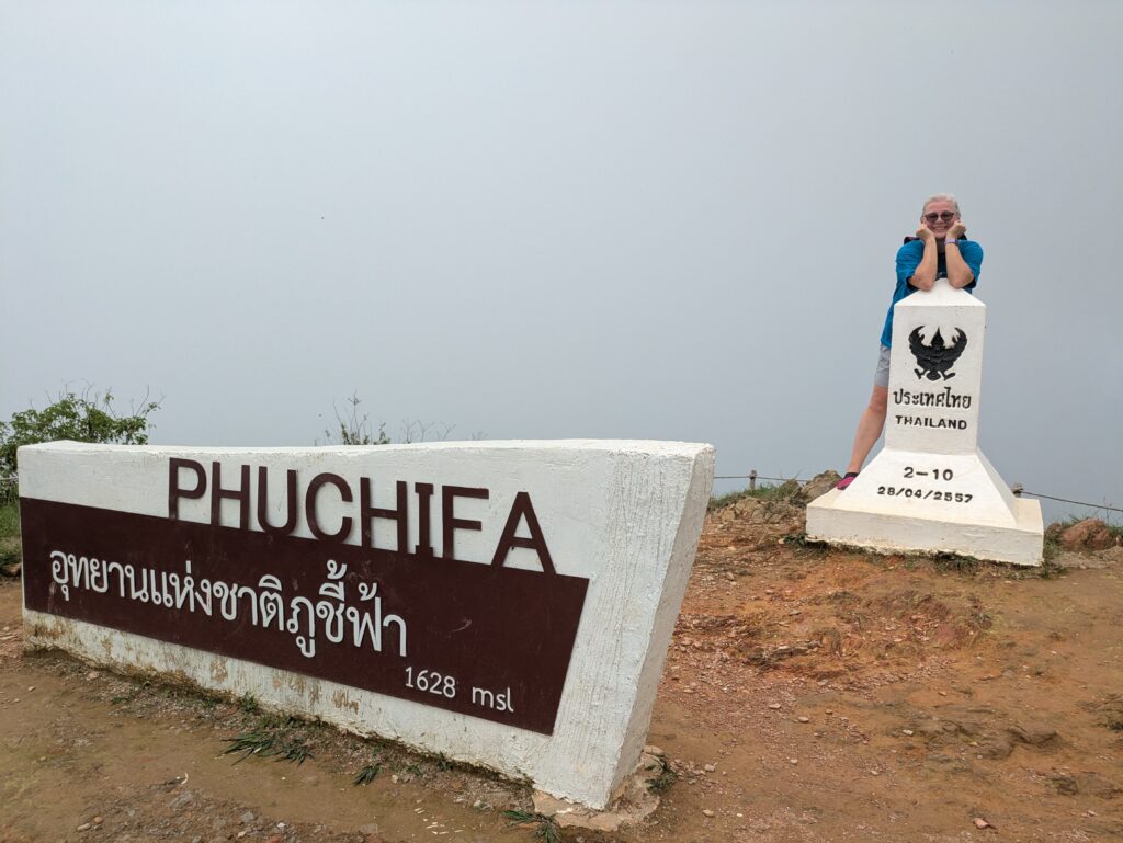 We loaded back into our car and found the turn out for the Phu Chi Fa National Park and took the road up to the parking area. We got out and the parking attendant told one km to hike up to viewing area. So we went up! The first part was along road that has been blocked off – that ended at a newly built parking area with newly constructed buildings, not finished completely. This is all new since Paddy’s video of this place. Now the way up became a natural, slippery trail because it’s moss covered. We finally arrived at the viewpoint – it’s a massive jut out, with a marker on the border of Thailand and Laos. Technically we are in Laos up here, but there is no border checkpoint because the only way here is from the Thai side. Anyway, the main reason to come here the views! You can see valleys to rolling hills to mountains, all covered in so many shades of light to deep green with sprinkling of color spots where buildings were. Beautiful! The air was so clear, but dappled with clouds and sometimes misty as the clouds were ever changing. One minute was sunny the next was wispy, light cloud layers creeping up the mountainside engulfing us and our view. It was amazing! God’s handiwork on display!!