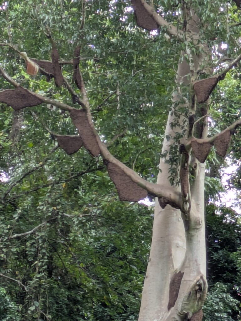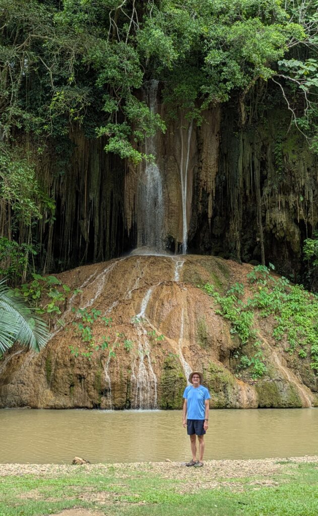 We happened upon cool waterfall, just on the side of the road. We had to flip a U turn to go back. We found the parking and paid the 30 THB (93 cents) to park our car. We crossed the road to get closer. There was bridge to cross a stream to get really close but the flooding in 2024 rendered the bridge twisted and unusable. That was a sight – don’t mess with mother nature! There were signs about the flooding and signs warning of “poisonous” insects, then we saw a large tree that was filled with huge wasp’s nests. But we continued, because it was a great-looking waterfall, called Phu Sang. It was like a Hollywood movie setting, set back in vegetation with a “flowing-esque” seeming rock coming down like stalactites with the fall of the water flowing over this onto a mound of more rock. What a fun, cool waterfall.
