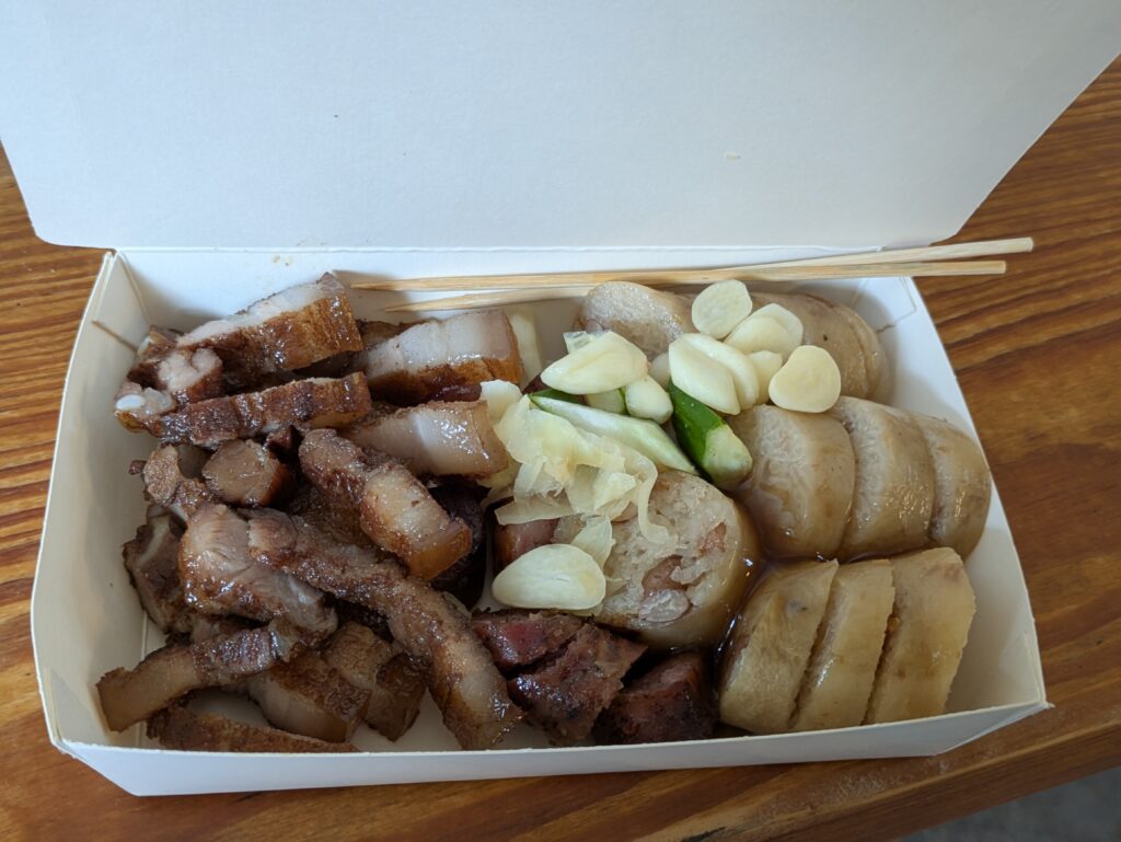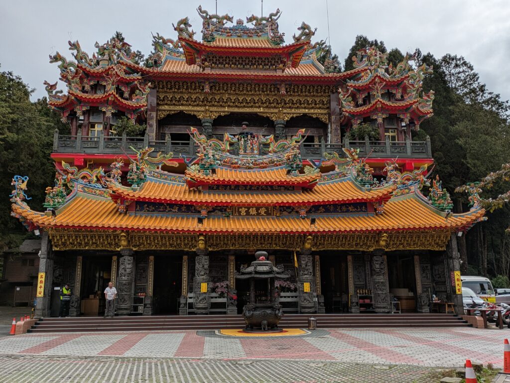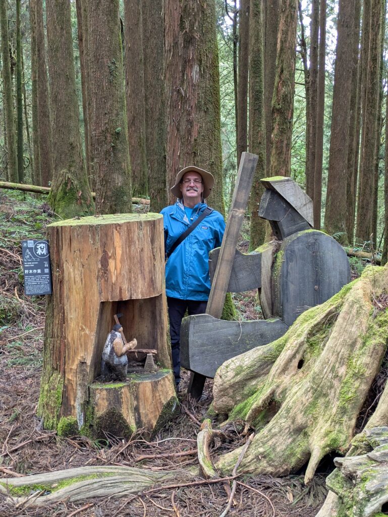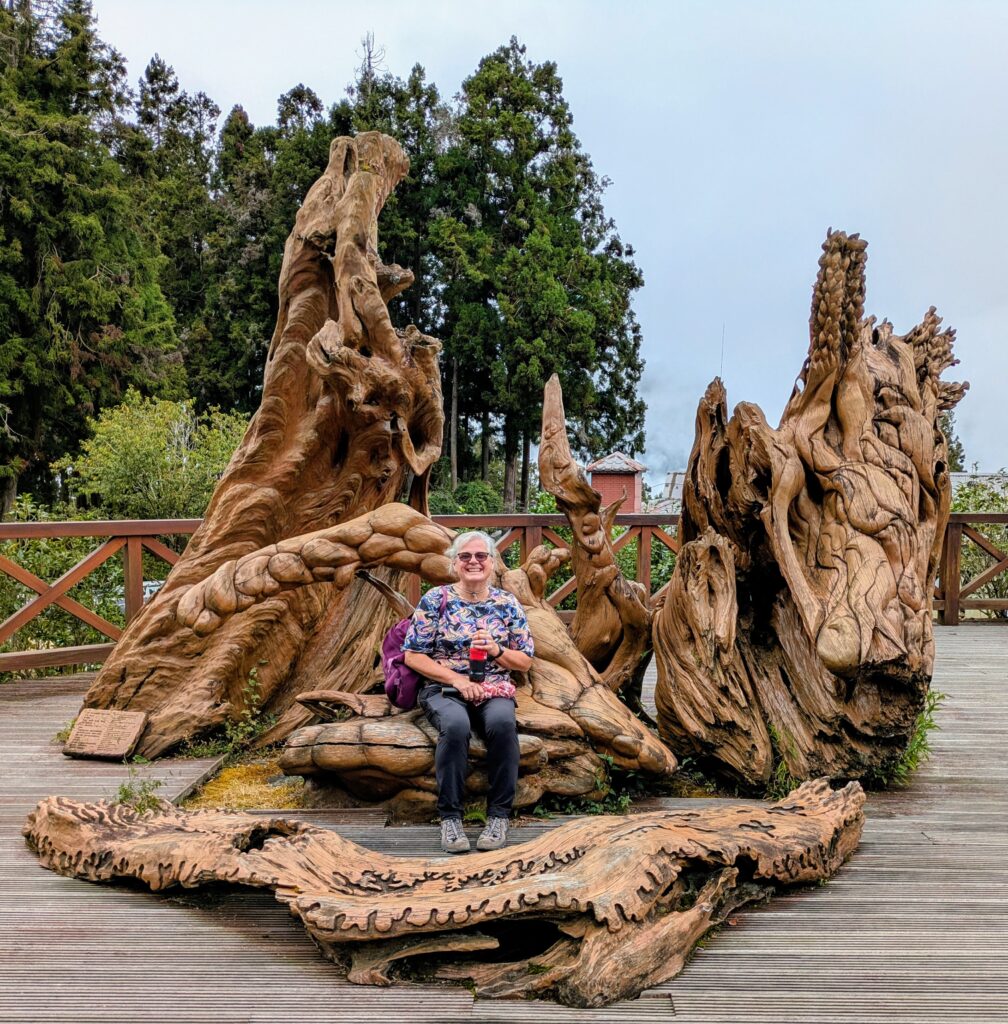 We walked on seeing a group of four trees, called The Four Sisters. These four trees grew from seeds that had fallen into cracks of a cut down cypress tree stump, according to a placard. A few feet away were The Three Brothers – same story. Fascinating! Then another placard named a stump The Pig-shaped Old Stump. Along the boardwalk, more placards explained different trees and stumps. There were also some stumps turned into art. It was just nice to explore and enjoy nature in a cool temperature without rain. Then we circled around to an over-the-top temple, called Shouzhen Temple. There were more tourists here, because there was a food court. It was 0945 and we hadn’t eaten, so we took advantage of a stall that translated: Secret Grilled Sausage Shop. We shared a grilled pork belly, sausage, and peanut “sticky rice” sausage dish. What a good breakfast – it cost 250 TWD or $8.11. When we finished we went inside the temple. It had many great 3-D wooden scenes.