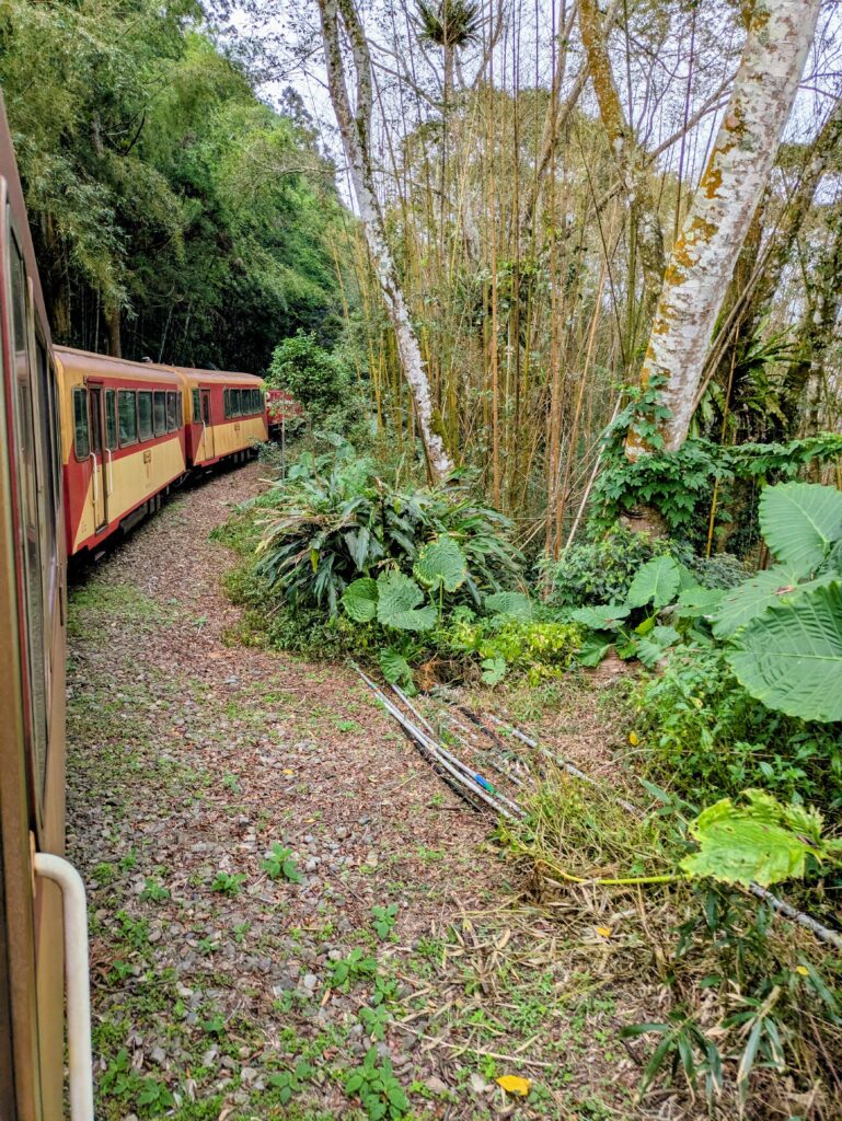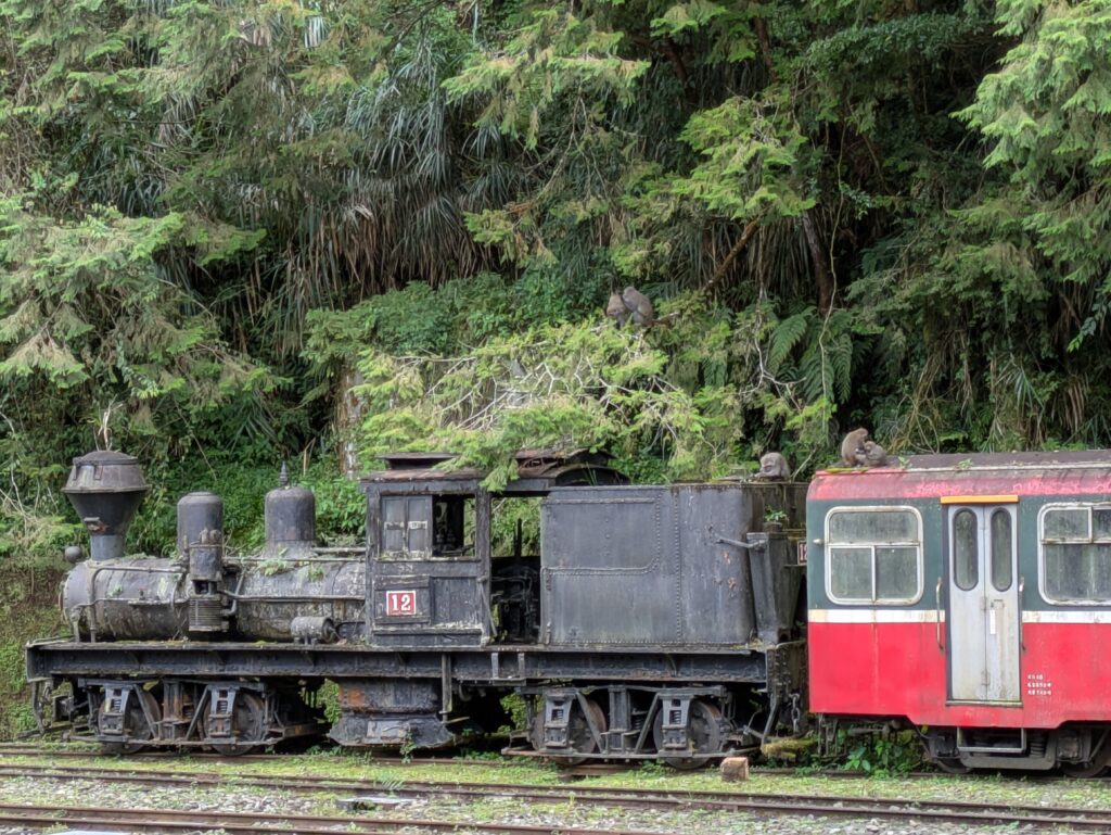 We arrived back at Alishan Train Station by 1115 a little early. But we were entertained seeing monkeys clamoring on an old engine and car. At 1146, there was a whistle for an all aboard on the train with on time departure at 1150. The train started out – going backwards! At 1156 we pulled into a switchback and then continued going forward now. The train did this twice more- so three switchbacks total. We had all the elevation to lose that we had gone up on the bus! The train went through tunnels- Tunnel #1 at 1214. Tunnels number 1,2,3, and 4- being very long, then 5,6,7…to 50 total! And there were more bridges (some cool trestled and truss ones) than tunnels. A lady gave us running commentary, but most of the stuff we could not hear. We just took in the scenery when it availed itself. The skies were a lot more socked-in with clouds, and it sprinkled most of our way back. We saw the tea plantations; the big bamboo groves- many that seemed to be dying(??); and so many more trees as the forest transitioned through different elevations. There were some pink and white blossoming trees, but I didn’t catch what the lady narrator called them. As we came and went through the various train stations, people young and old were standing, waving, and taking photos as we passed. What fun!