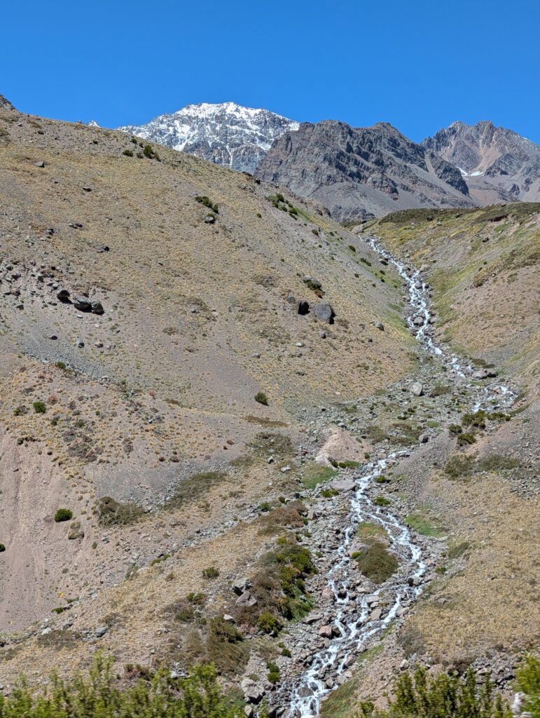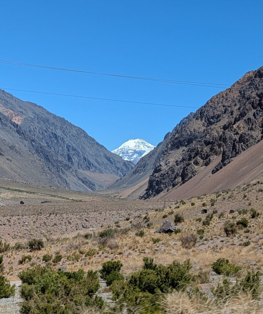 Once out of the cities, we start winding through farmlands and hills towards some looming mountains – when it is not farms the land is dry and rocky… lots of cacti. We bypass a turn down to Santiago, keeping north. At 1040 I spotted our first snow peaked mountain in the Andes range. We slowly make our way there. A river, the Aconcagua River, has joined us and meanders along a rocky wash beside us, sometimes moving swiftly. Around 1100, we passed through the city, and suburbs, of Los Andes. Along the river there were a number of weeping willows and poplar trees. Then finally the bus climbed enough to the edge of the treeline. Jeff looked it up and we were about one mile high. The river changed names to Rio Juncal, as we get close to the international border of Chile and Argentina. Mountains are very rugged and craggy. We came to switchbacks that started with curve number ONE! It ended with 20 and lots of elevation gained!! Then two or so tunnels and more “every-which-way” switchbacks! These weren’t numbered. Crazy!! Then a very long tunnel and once out we were at 10,625 ft elevation. We also crossed the mountain line pass, and the border.