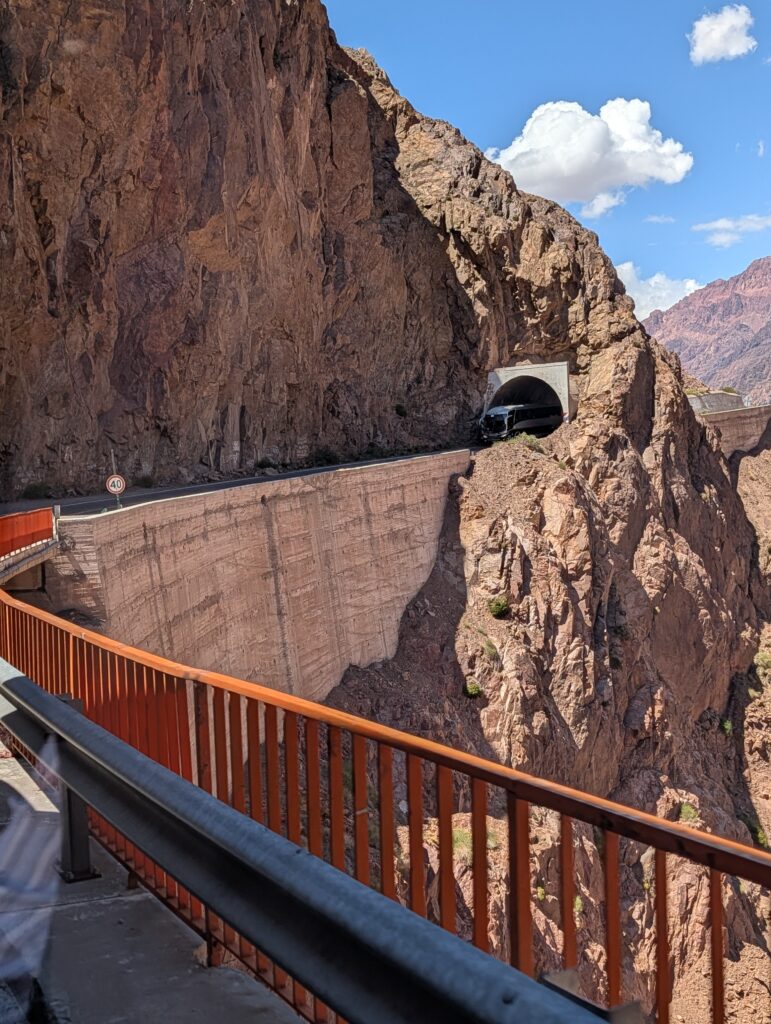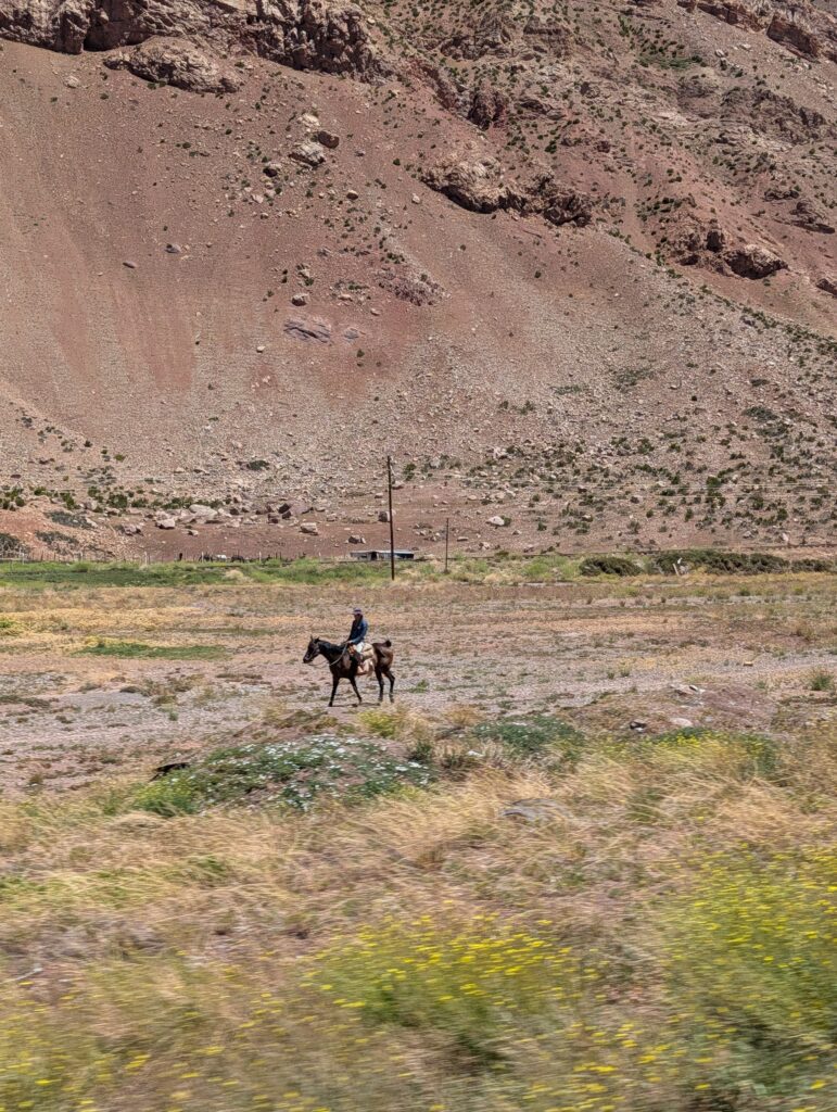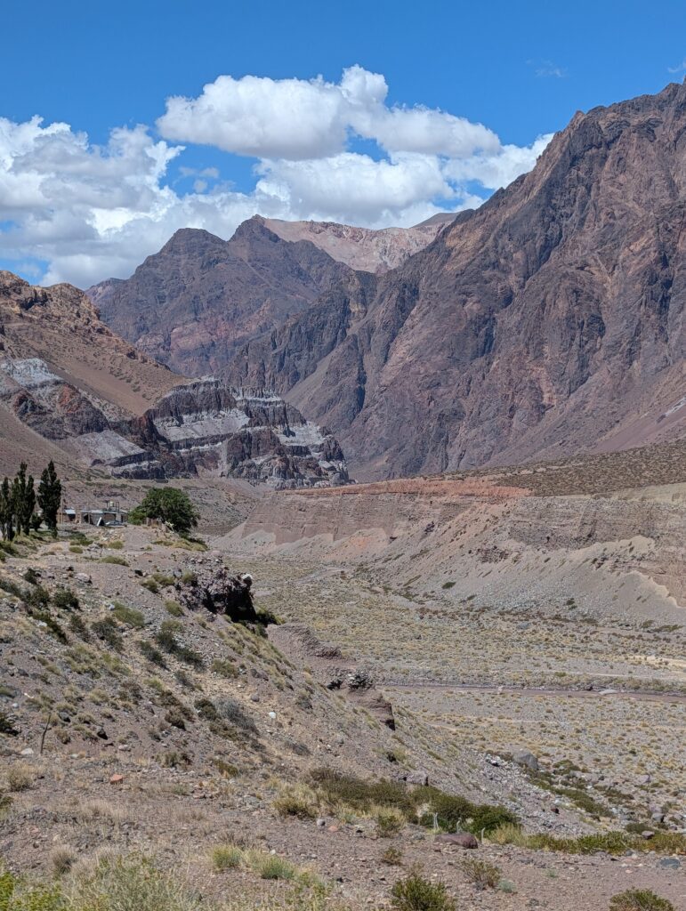 We didn’t stop, which was a surprise. It was 1240. Now the river was brown and the water was flowing the other direction… it is always unexpected to see the change of direction, but understandable. There were signs for “avalanche prone” areas here, and the mountains had very little vegetation on them. You could see evidence of rock slides. Then we went to immigration control – at least six buses were in front of us. It was 1302. We wait… and we wait.. tick tock. Finally at 1405, we disembarked the bus and walked to passport control, and loaded back up on the bus driving for a couple of minutes. At 1434, we disembarked again for luggage and X-ray. 1440-1445 back on board. The bus moved out of the immigration hangar to stop, yet again, at a food area. Half a dozen people got off for food, and one of the bus men came around with a cup for a tip, I guess? Questions?? Finally we started, really going at 1500. According to signage we have 192 km more to go to get to Mendoza. We descended a lot, but not switchbacks. The mountains were very bare here, but with lots of colors in hues, swirling and in spotting through the peaks… Gorgeous!!! The river is now called Rio Mendoza, and it’s slowly carving a grand canyon. There was a railroad track through the valley – now abandoned, but the old truss bridges add to the desolation. The river has left a plateau along the other side. I’m frantically writing because I have to stop to snap a picture that just revealed itself. What a ride this is!!!
