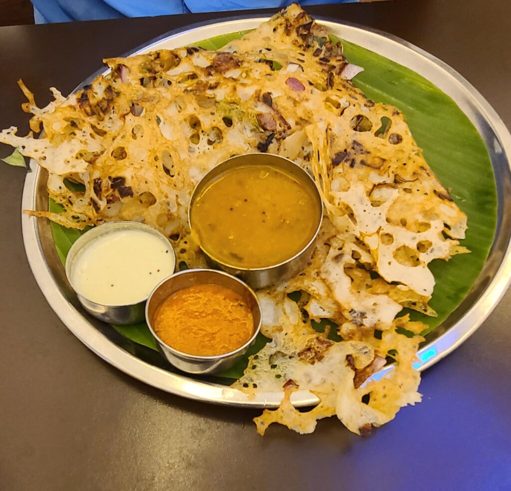 Then he kindly dropped us off at Shanmugas “The Vegetarian Restaurant,” as we were starving – we haven’t eaten yet nor had any coffee! (It was only noon, but we have been up for eight hours!) We had an Onion Rava Masala Dosai; a dish of Garlic Cauliflower with Garlic Naan; and a Cucumber Raitha (yogurt with chopped cucumber, green chillies, and onion). Jeff had a mango lassi, and I had a chocolate milkshake. It was good and filling.