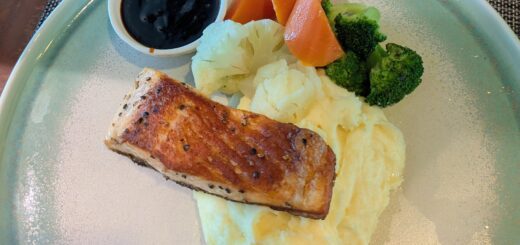 At our place we made pan sauteed tuna steaks with a fish mustard curry rub we found at the store. We also cut up a mango (our host had left for us) with some red onion – soaked in juice from half of the lime, and some King coconut milk (also from our host). It was a throw together meal, that turned out nicely! Had a siesta, since almost everything is closed except for grocery stores and bakeries. So will be a laid back weekend. Plan for a light supper and hopeful for a sunset – but it is very overcast.