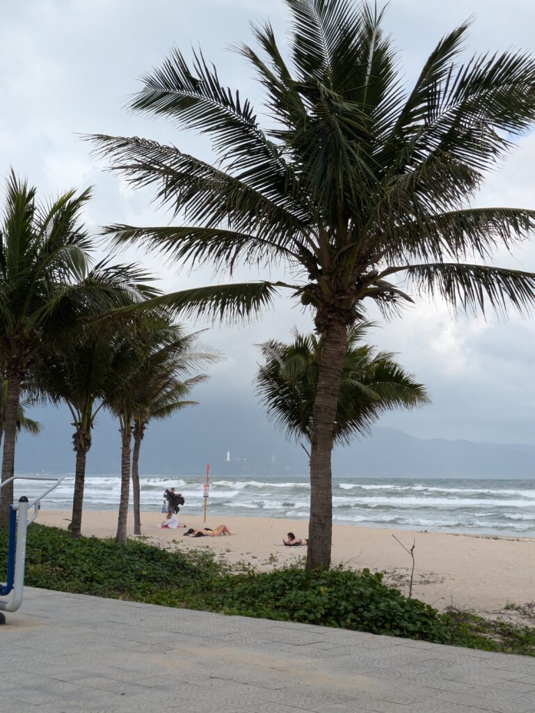 Back to our room. We had housekeeping come in. It seems a different crew each day, but always two ladies, and they are efficient. Morning gave way to lunch time. We had grilled cheese sandwiches. Afternoon was just “minding” our phones, computer and adjusting plans, as the weather cloudiness continues, with bits of rain. But we found a break and were able to go out. We went down along the ocean, on the “boardwalk”, so to speak. The ocean waves are still pretty aggressive. I am beginning to wonder if it is ever placid here, or at least less tumultuous(?) Questions?! We enjoyed our walk, though, we never actually stepped on the beach. We heard and then finally saw the man hawking Bun Bo. We have been hearing him multiple times a day from our room. He is on a scooter with containers and a loud speaker. Crazy! Anyway we went back to our room and chilled out.