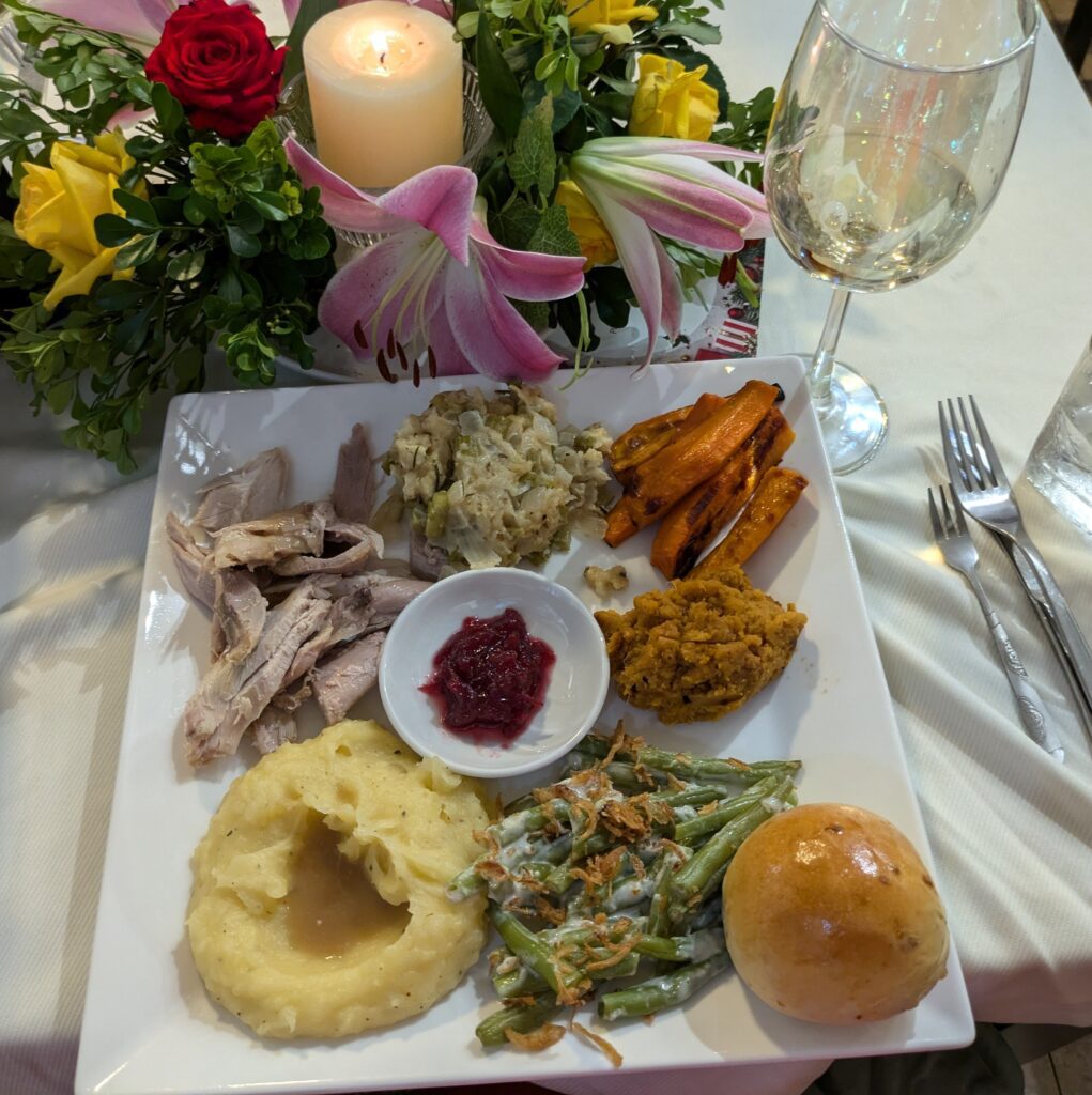 We were served our first course – caesar salad. Then came the main. OH MY!! A big plate, unusual here in Vietnam! It had all the “fixin’s”! There was turkey or ham (we had one each); dressing or stuffing, that was fragrant with fresh rosemary and more onions and celery than actual bread pieces; mashed potatoes with gravy – real potatoes but lacking flavor without the gravy; mashed sweet potatoes, with bits of nuts; green bean casserole with a cream sauce (not mushroom soup) topped with fried scallions; mac & cheese – homemade with stretchy, gooey cheese; braised carrots, cooked just right texture; cranberry sauce; and onion roll with butter. WHEW!! Needed a breather, and a stretch to process all the food… sound familiar?? This made it a real Thanksgiving meal. Then we were given choice of pumpkin pie, pecan pie, or apple pie. We choose pumpkin and pecan. I would have liked to try the apple, but…well. We also had a Chilean Sauvignon Blanc – Valdivieso, that accompanied our meal very well. What a grand evening. It was a date Thanksgiving Meal, unusual for us, but it special. The bill was 1.4 million Dong ($55.23). Jeff gave 1.7 million Dong ($67) as it was an exceptional meal and the staff were very attentive in their service.