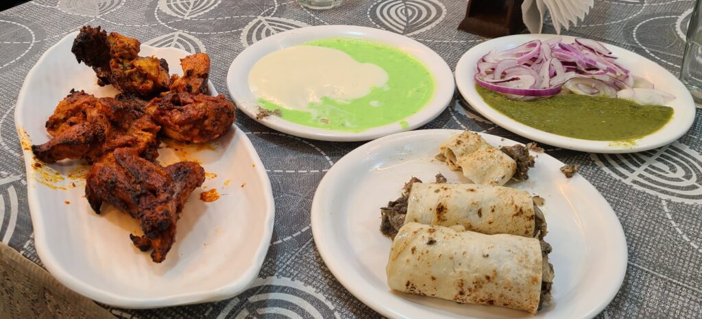 From here, we left the park. Only thing on the agenda now was to get food. While we were searching we did see another pharmacy. We stopped as Jeff took the last Imodium we had (we forgot to get it yesterday). As we were waiting for the person to help us, we did get some pet therapy in. They had a huge dog out front and he just was begging for pets. This dog reminded me of the neighborhood Saint Bernard – Wilt was his name – where I grew up. They both were about the same size and both were just as clumsy, in- the-way-loveable. Anyway, after leaving (and removing all the coarse hair from our clothes), we found lunch. The restaurant was Novelty Chicken Corner. They had a spicket of chicken that looked great. So we went up to the sit down area . We ordered a half of a Tandoori Chicken and a two piece Chicken Shawarma Roll. They looked great but my stomach did a lurch so I stopped eating, and ordered a side of french fries. Sometimes I just get a taste of some herb that just sets me off. I wish I knew which one it was, but I still have not isolated it. Jeff was thankfully having no problem 😋!! We did have to get the last of the Tandoori Chicken to go.
