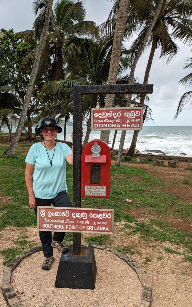 Now, we took a bus in proximity to the southernmost point of Sri Lanka and to the Lighthouse of Matara. We then walked some seeing and hearing many critters – lizards and peafowl – on the way. Also we saw trees trimmed along the power lines and poles – wonder if their power was shut off? Just saying… Then we arrived – well, we actually could not physically walk out on the place that is the southernmost point! It was Private property! How disappointing, we got close and took pictures of the little beach/rocky outcropping. Well, that felt like a failure, so we went on the lighthouse. When we arrived here, there was a sign for “Dondra Head – Southern Point of Sri Lanka.” Wow! – well, that made us feel… some better. We did our photo op. The lighthouse is not open to public. . so all info we found was online – has been computerized, is 161 feet tall, and was built in 1890. It is the tallest in Sri Lanka and supposedly one of the tallest in S.E. Asia. Anyway, it is a big white beacon with lots of palm trees around it!