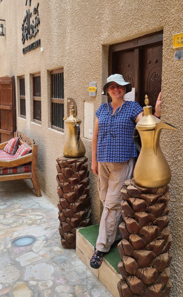 We went out noonish. It was 100 degrees with heat index… 137 degrees. Absolutely crazy!!! Anway, we went to a coffee museum and they had coffee sampling- nice way to get some coffee. Another couple was there, and we struck up a conversation. They were from USA- Chicago, but now live in Abu Dhabi, which is the capital of UAE (United Arab Emirates). It is just down-the-coast so to speak, from Dubai. The man works here since April, and the woman moved here when her school ended. They will be living here full time now. (It’s not where I would pick, c’est la vie.)  It was a nice coffee museum. They had all sorts of coffee makers, percolators, even old tins to place on a fire. Then the tasting was of two kinds of coffee: first, was an Ethiopian coffee; second, was an Arabic coffee with cardamom.  Jeff actually tolerated this one (he got a tasting also, so I could have more coffee. He loves me  😉 ).