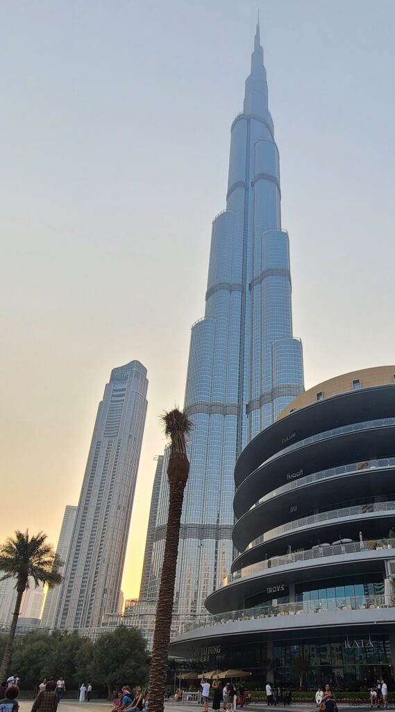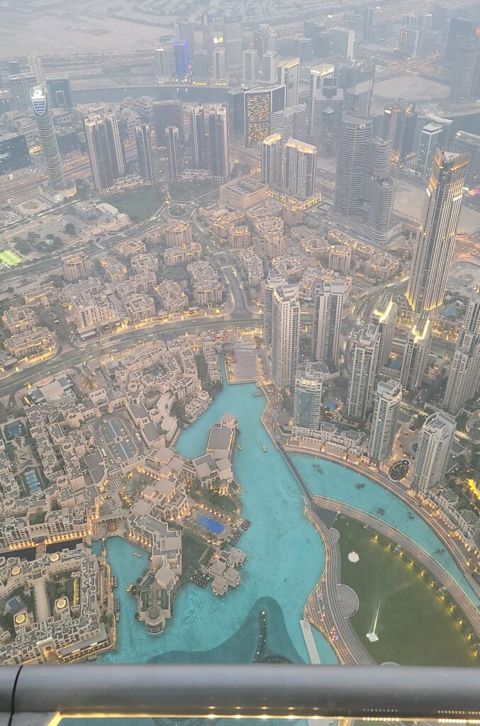 Found it- we had to go to the lowest level to go up, up, up! We splurged here. Our tickets enable us to go to the top, under VIP privilege, which is 148 stories up! Sunset over Dubai from a dizzy height! Jeff was even having some issues this far up. This is an outdoor observatory, as in open air but has a lot of glass around us. Okay some stats: 828 meters (2,716.5 feet) tall-tallest building in the world; tallest free-standing structure; highest number of stories- more than 160 stories; highest occupied floor; highest outdoor observation deck; elevator with the longest travel distance. The top of the building can sway 3m/10 feet each direction. We could definitely feel movement! The basic design-structure of the building is like a Y shape, inspired by the Spider Lily. There were more than 12,000 workers who worked on-site, and more than 22 million man hours to build the tower. It took six years- time of excavation to lunch opening January 4, 2010. There a so many more stats. We enjoyed the exceptional views (even though it was still hazy in Dubai). We timed it so we could watch the fountain/light display. Fantastic! The whole city is lighting up now, very sparkling! We were treated to juices, water, tea, dates and cookies. Next, we took the elevator down to the other observatory areas, stories 124 & 125. ( BTW- the elevators are very smooth and fast!) From here we watched the fountain/light show again. This level has a bunch more people milling about, and has touristy items to buy. Finished we went to elevator to go down. There was a huge line for the elevator, but one of the perks with our tickets we could skip the line and were escorted into the next elevator. Back down we watched the fountain/light show our fourth and last time (second time from ground level). Each time they play different music. Took metro back to our hotel cooled off the bed. It was exceptional to go up – to the top of the world in a building, but Jeff and I both agree maybe, just maybe, we should not be up that high up in a building.