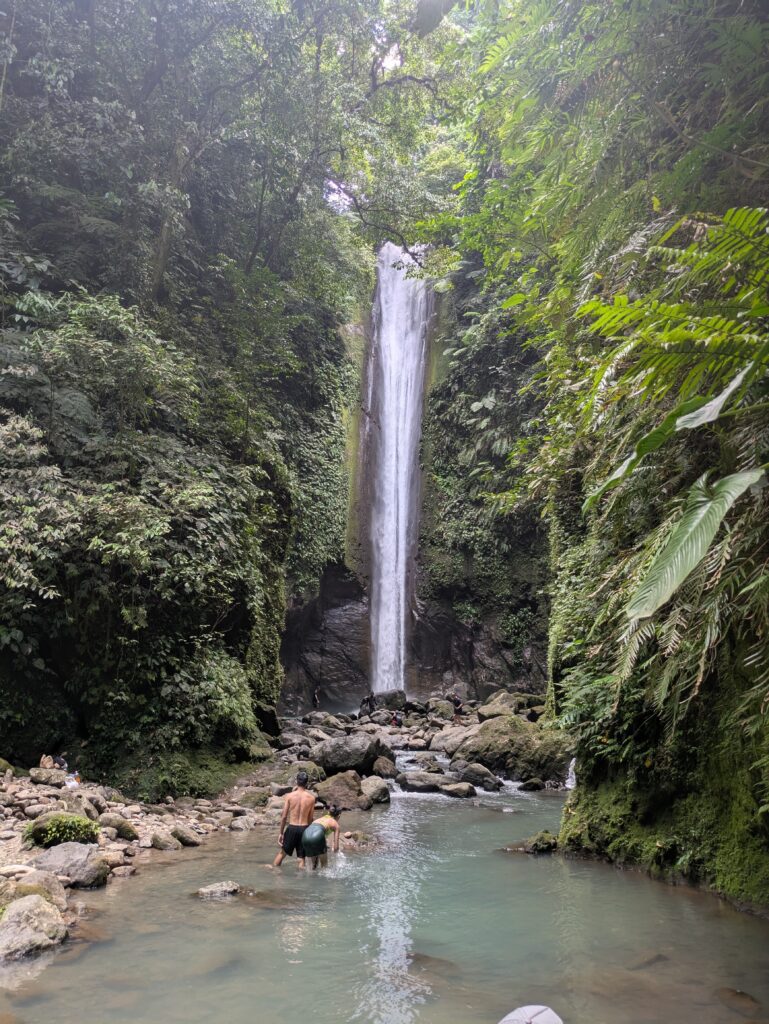 Anyway, we all made it without any slips or “swimming” detours… AND WOW! The waterfall was absolutely stunning! Sure the work to get there may have helped make it seem better, but I was in awe! Albert said the waterfall is 35 meters tall, which is 115 feet. I asked Albert if the volume gets to be more in rainy season. He said it does, and it is a lot more. Their rainy season begins in August. The volume now seemed quite a bit, but we are in the middle of the dry (and hot) season right now. I would not be able to come here with the swollen river, but I bet the waterfall is really powerful and I can’t imagine how full. Albert said the typhoon in 2011 caused damage to the pathway – as in there were walkway bridges. So the river fordings we did are the resulting damage. Anyway, we clambered up onto a rock for a photo op, and then sat and took in the view as we cooled off. There were some young locals here also, with one couple swimming. After we cooled off, we reversed and hiked back and forth through the river, up the steps and out. That was a great experience! So glad I was able to do it.