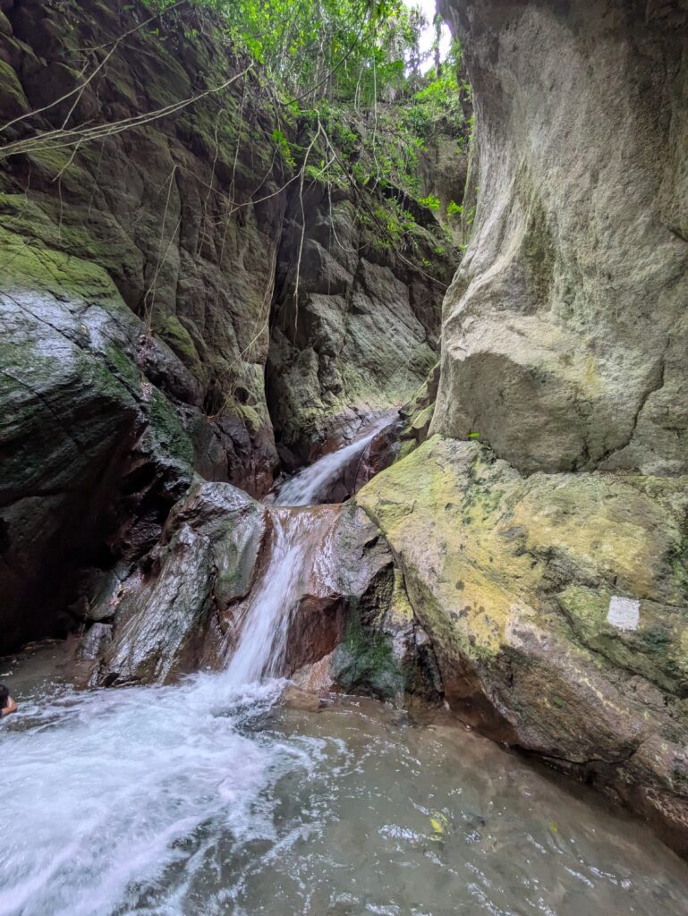 As we arrived, we noticed the first small fall going into a little pool. A man and the young boy were enjoying this first pool. The lady was just off on the side enjoying watching them. We stepped closer to see the other part of the waterfall. It shoots down a slot canyon like area into an upper second pool. We did not get into the pool or explore to see a better view of the upper fall/rapid area. It seemed it would take some maneuvering – beyond my capability – to get up there. We took some pictures and decided to leave without swimming. The pool is little and we did not want to disturb the family. The kid was really enjoying the pool and waterfall – it was worth just hearing his enjoyment. Once we returned to the scooter, Jeff gave a 50 PHP ($0.89) donation.