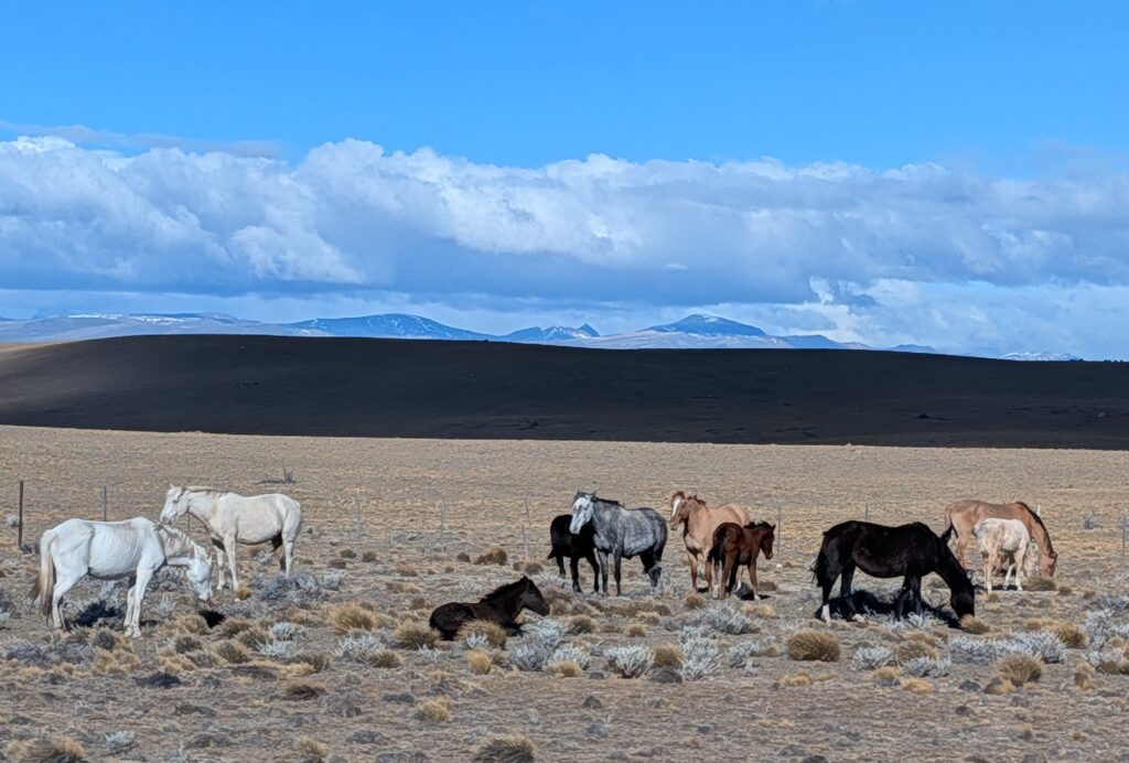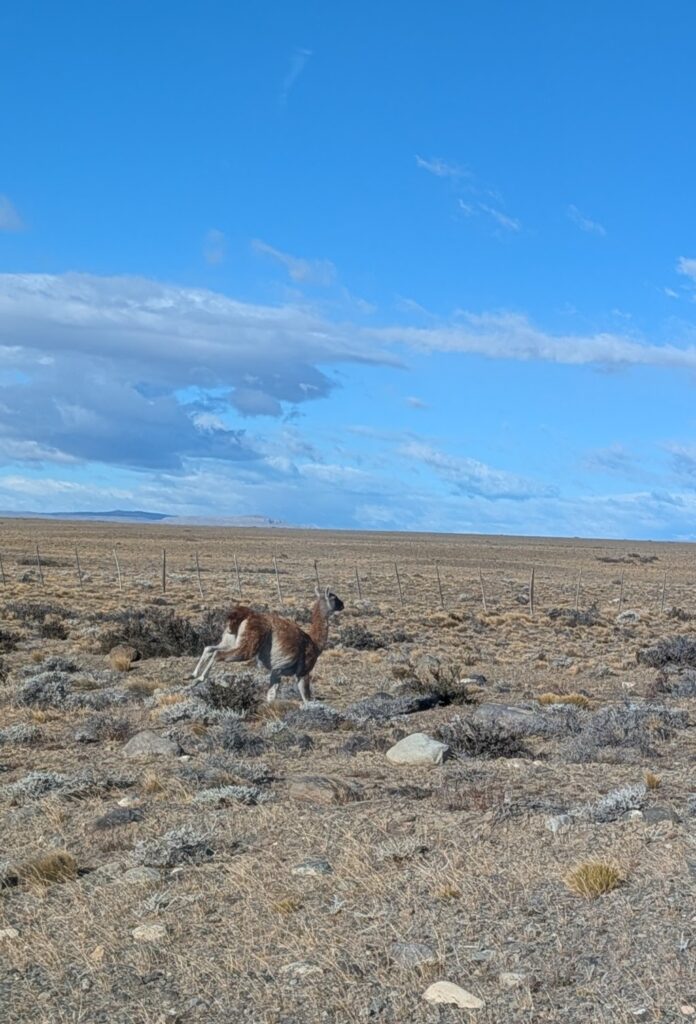 We saw the guanacos (llamas) again. They look cold , as the wind whipped their fur(?). Also we saw the same horse herd – pretty sure, it was them because of a grey one with a white face. There were more soaring Crested caracara; and more cattle. Finally, we saw a single rhea. The day was not as bright, sunny as when we did this drive four days prior. But the water color is still stunning in hues of blues. The wind was pushing us the first leg back so Jeff was not as affected while driving.