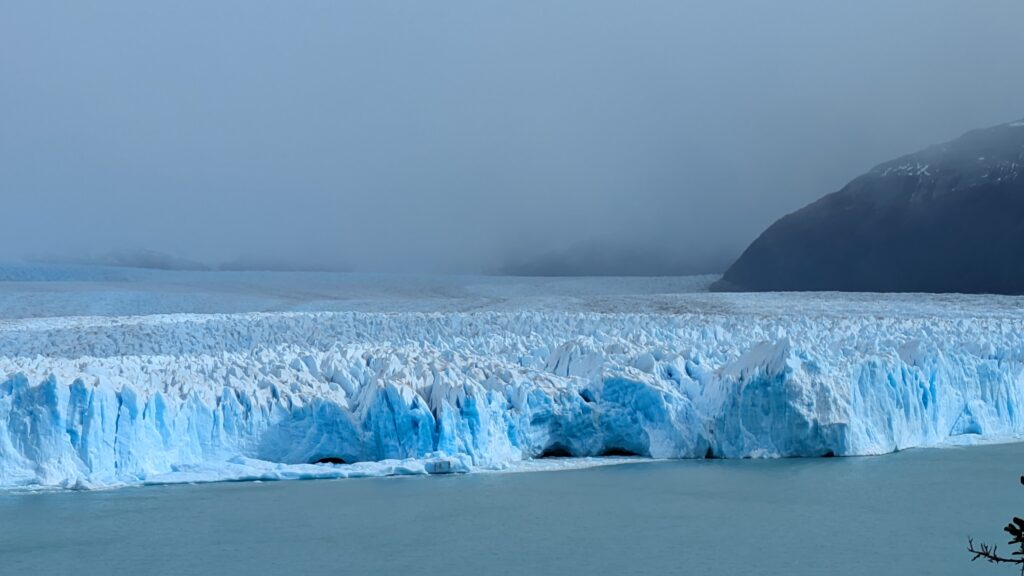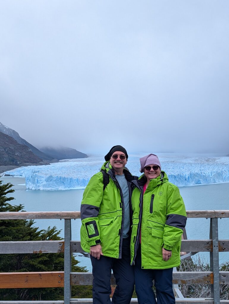We arrived at the park entrance and Jeff showed our electronic Flexipass Ticket. The boys had to buy their tickets, but this was faster than trying to get our e-tickets pulled up! Anyway, we all loaded up and drove to the main attraction – the Glacier Perito Moreno. The drive, similarly reminded me of the drive to get to Yosemite Valley, when you come up to the viewpoint… The park has built up an extensive walkway system for views of the glacier. We arrived here, parked, and parted ways with the men, wishing them well. Then we caught the free shuttle bus to the walkways. Wow 😮!! The glacier was beautiful! Could you get tired of seeing these??? So many colors are present – a whole hue of blues and even some pinks blending into craggy, gnarly points and crevasses that make up the wide glacier grinding down to the lake it becomes. Breathtaking and magnificent!! Placards at viewpoints give facts and stories. One factual sign listed the Glacier front heights from the shortest crags – approximately 40m (131 feet) – to the highest points – approximately 70m (230 feet). At one of the stops we saw a decent sized calving event! Then we heard the thunderous breakage and plunge. I had forgotten about the delay…that is so cool! We were noticing the sun being muted by clouds rolling in and it started raining, of course it did. And hence we left. But so glad we came!