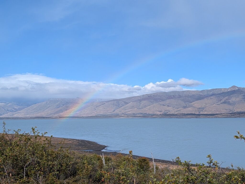 We drove back into the town around 1.5 hours 49 miles. Along the way we saw a rainbow unfold. It had one of the brightest strips of purple, I can remember seeing for quite some time. We arrived and stopped at La Tolderia Resto/bar for “lunner.” We had two empanadas – one lamb and one guanaco – as starters. This was our first experience of Guanaco meat. It was more tough, but not as gamy as we thought it might be (but it was mixed with herbs in the empanada). We also had a Wok de Cordero or Lamb Wok dish, a stir-fry of lamb, veggies and rice topped with sesame seeds; and a Calabaza Rellena or Stuffed Pumpkin (actually a butternut squash) with cheese and veggies. We had a Casa Ambrosia Malbec wine from Mendoza. We paid 89,980 ARS or $64.91.