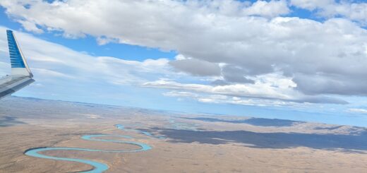 We drove back into the town around 1.5 hours 49 miles. Along the way we saw a rainbow unfold. It had one of the brightest strips of purple, I can remember seeing for quite some time. We arrived and stopped at La Tolderia Resto/bar for “lunner.” We had two empanadas – one lamb and one guanaco – as starters. This was our first experience of Guanaco meat. It was more tough, but not as gamy as we thought it might be (but it was mixed with herbs in the empanada). We also had a Wok de Cordero or Lamb Wok dish, a stir-fry of lamb, veggies and rice topped with sesame seeds; and a Calabaza Rellena or Stuffed Pumpkin (actually a butternut squash) with cheese and veggies. We had a Casa Ambrosia Malbec wine from Mendoza. We paid 89,980 ARS or $64.91.