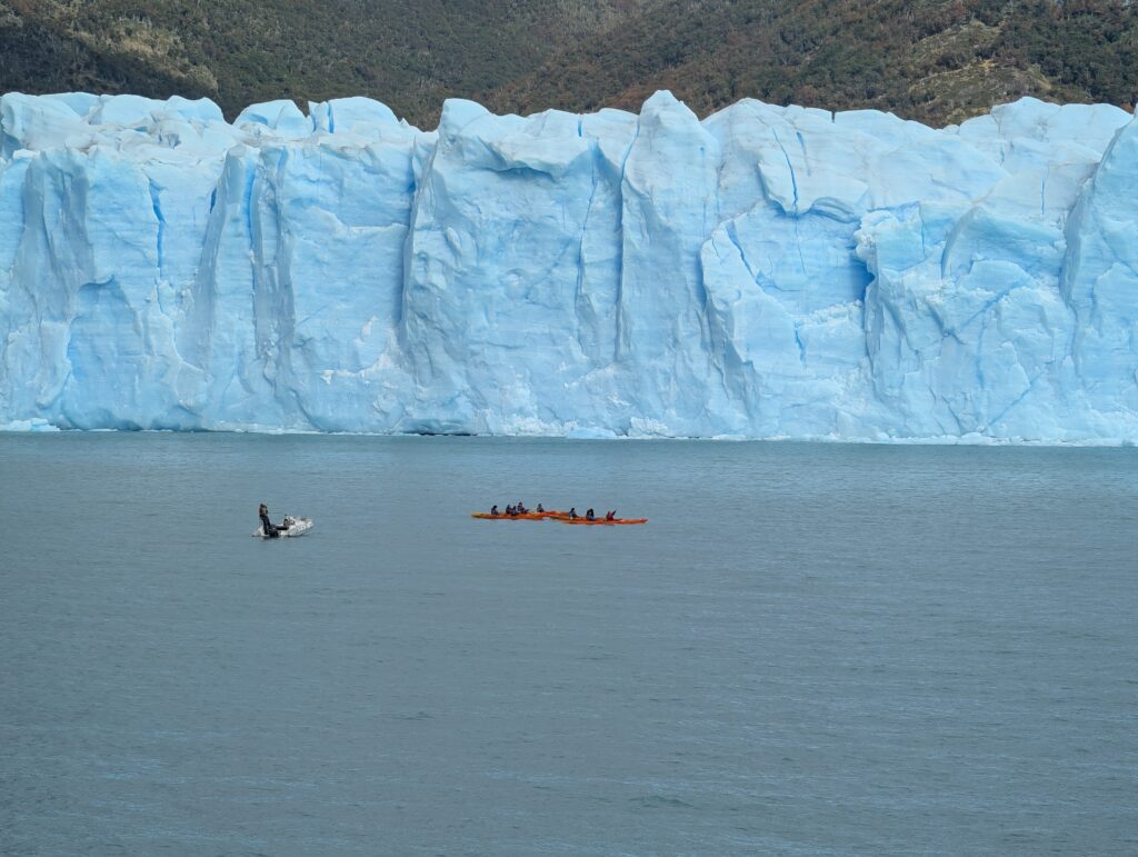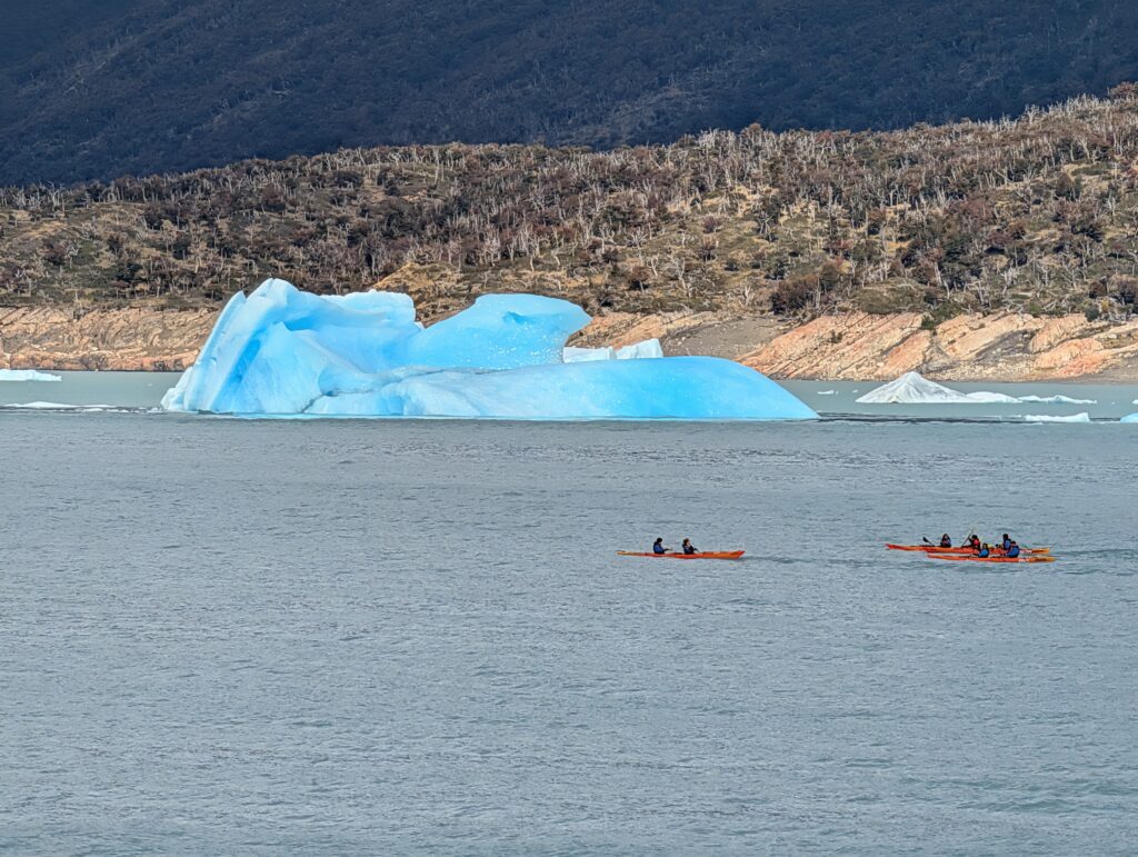 At 1500, we turned toward Perito Moreno Glacier. This was the same glacier we saw Tuesday. This glacier is so well known because of its accessibility to land. One does not have to take a boat to reach it. There were kayakers out on the lake with us. It’s a gorgeous day! The sun even shone on the glacier. We got very close and saw a nice calving, then we had to cross the strait to the other side. About a third of the ship disembarked. Then the Captain took the remainder of us back close to the glacier face. I saw another massive calving- three spires of ice crashed down into the water! Jeff was going to the other side of the boat and missed most of it. Finally, at 1610, we started our return back on Lake Argentina to the port.