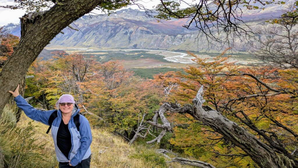 It was a beautiful day as we started at 1115, and it was a 4 km hike up to the lake. The trail started at a stepper incline, but was a nice dirt, well-trodden trail, very doable. There was a brisk to downright pushy wind, most of the hike up to the lagoon. I was surprised how many people there were, I do not know why I was surprised. Anyway, the few trees that are here, and some tall brushes were changing to reds and deep oranges. The valley of a meandering stream, as well as the small town of El Chalten came into view quickly as we gained elevation fast. There were a couple of open spaces that opened up for killer views of both areas -great photo ops. One such area was very windy and we had trouble standing. The wind actually blew my gaiter-cover off my head! Then the trail split and we took the way toward the lagoon.