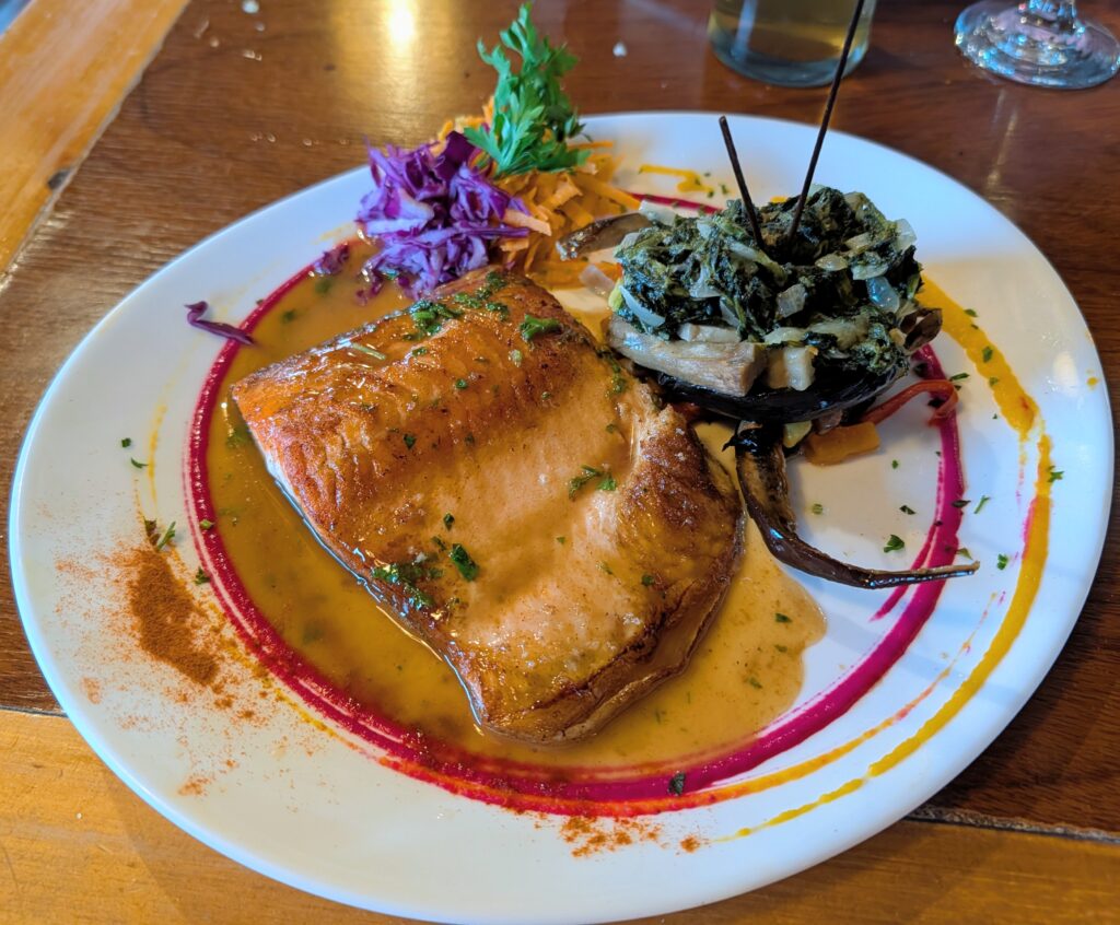 We awoke to rain, and it went on all day! Today was our connection day so it worked out. Breakfast was oatmeal with our Javas. We talked with my mother and her husband. Then zoomed with our church back home. We then went out for lunch at La Tapera. We had Locro Cazuela, a local specialty “casserole” dish. It was more like a stew of various meats (bacon, beef, chorizo, and tripe) beans, corn, and veg. with a spicy sauce to mix in if desired. We also had a grilled Salmon with lemon butter and a swirl stack of veggies. Both were excellent meals! I had glass of white wine and Jeff had a local craft beer. We were given a hunk of homemade bread, and when we asked for the bill, we were given a shot of their homemade liqueor. That was like a peach brandy! The bill was 98,100 ARS, which was $70.40!!! Yikes! Eating out here is definitely expensive! But we kind of knew this coming here. There was undoubtedly some shock though. Good thing we had the shot of homebrew!
