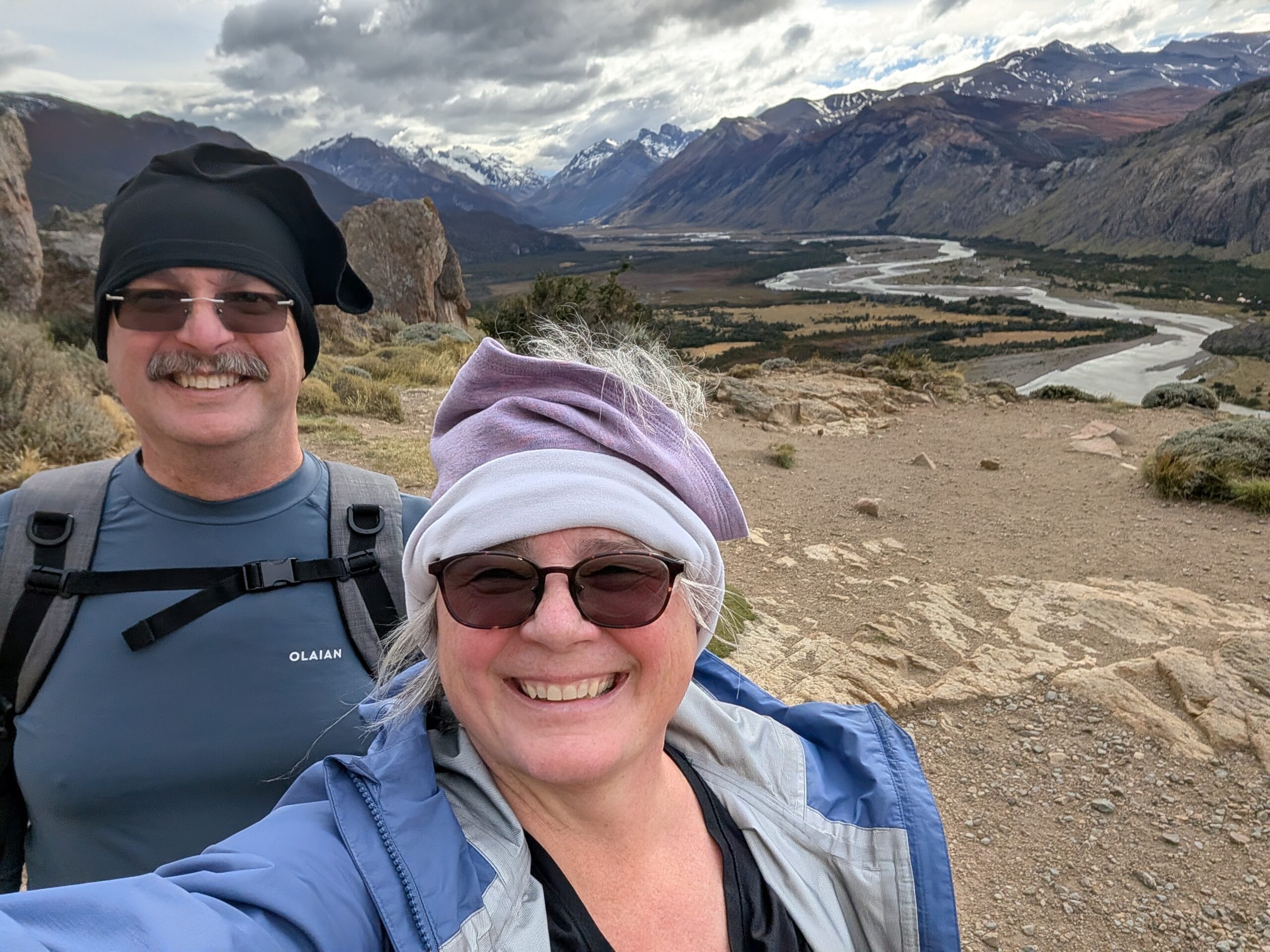 The rain really came down while we were eating. Once in the car we drove around the little village of El Chalten. It’s been built up because of tourism and thrives due to it. Most of the businesses are restaurants, places to stay, and convenience stores. The town is only 1400 population, with the side roads still being gravel. Anyway, we arrived back to our place, I blogged some, Jeff read. My sister was busy, so will catch up next week. We had grilled cheese sandwich for dinner, with sliced cucumber. Then we video chatted with Jeff’s sister and her husband. We went to bed around 2200, to the patter of continuous rain.