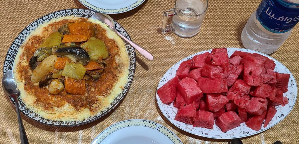 Arrived back and unloaded and readied for our lunch from our hosts. (He bought it down without her so knew it was just for us and they would not be joining us, as we had hoped.)  Wow – it was a huge platter of couscous with great sauce and tender beef (like a cut of what we would call roast beef, but still had bones), with hunks of pumpkin, carrots, eggplant, potatoes, and cucumber. Then also a dish mounded with watermelon (which will have to wait til supper). So good and flavorful, but way too much for two (wish they would have eaten with us).  Hope the sunset tonight will be good.