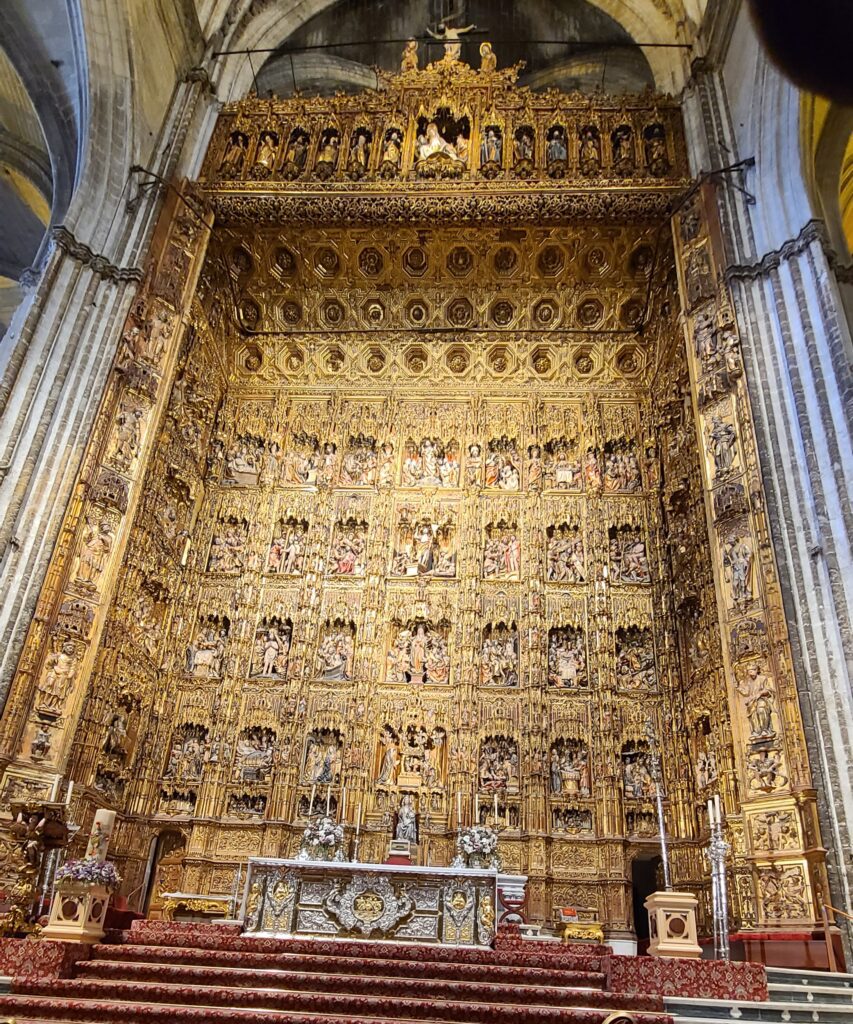 Anyway, we drive back to the Cathedral de Sevilla. We have a timed entry for 1:40. Also Jeff bought us an audio guide, which in hind sight was a blessing. This Cathedral is actually named The Cathedral of Saint Mary of the See (Cathedral de Santa Maria de la Sede). It is the largest Gothic church, and 2nd or 3rd largest in Europe (depending on how you measure). Overwhelming! It is so huge and grandiose. So many gold guided pieces/alters, but because it is so open and large inside it is not too over the top. The main alter is so enormous, it’s difficult to get in pictures (and the fact that all areas are behind rod iron enclosures). There are many, many art pieces, artworks and paintings displayed throughout the cathedral, at times it feels like a museum! Also displayed are Catholic bishops robes, headpieces, and vestment pieces. There is an ornamental headpiece that is said to have the 2nd largest pearl in the world. Another fact, Christopher Columbus remains are interned and prominently displayed. I almost forgot our ticket also included climbing up the bell tower. It was actually a relatively easy ascent, due to ramps not stairs, most of the way up. The views outside were great. One last thing to mention was there had just been a wedding, probably in the royal chapel. But this chapel is completely blocked off to tourists (even to view inside). When I left I was just stunned and still processing all the beauty!!