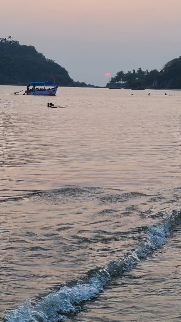 Finished we went the 50 steps (maybe??) to our place and took a siesta. I blogged and Jeff read. Then went out to see the same sunset as night before. (We haven’t seen a great sunset since South Africa. 🙁 ) As we were walking the beach a local gave Jeff a flyer for a ‘People’s Market – products from local community artisans’. We found it and went in. About the second vendor was a cheese maker, with real cheese. (We have not had real cheese in India.) It was great! Jeff went back to our place to get money. I hung out and looked around, but all other vendors were mostly clothes. So I just watched as foreigners seemed to flock to him. Found out he is Italian, but visited with his family and they moved here. He had learned cheese making from his grandfather, and has been making the artisan cheeses here since then. One lady was German and exclaimed “cheese!” (much as we thought). He gave samples to anyone interested (and all who sampled bought some). He had two buffalo cheeses (we bought the stronger one of these): and he had two cow cheeses: the one we tried was chili; the other was black pepper and it had not been cut on, or offered, so we did not try it. So with some of our supper in hand we went back to our place, only diverted to buy some chili cashews.
